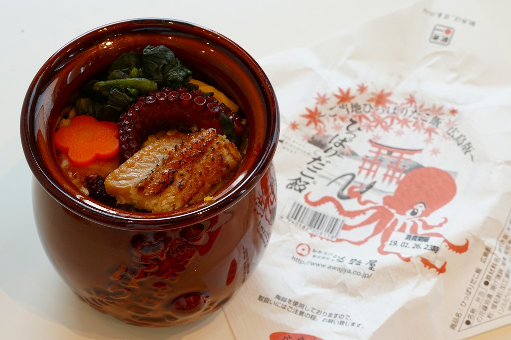 2018(平成30)年9月6日に広島駅で発売。兵庫県の西明石駅弁「ひっぱりだこ飯」の発売20周年を記念した企画の第2弾として、この駅弁の広島版を制作したそうな。見た目や内容や風味は、西明石駅弁とほとんど同じ。広島版ということで、掛紙に厳島神社の大鳥居を描き、中身に炙り穴子煮を加えた。2022年で終売か。