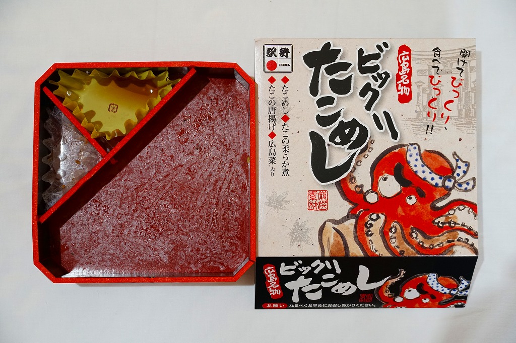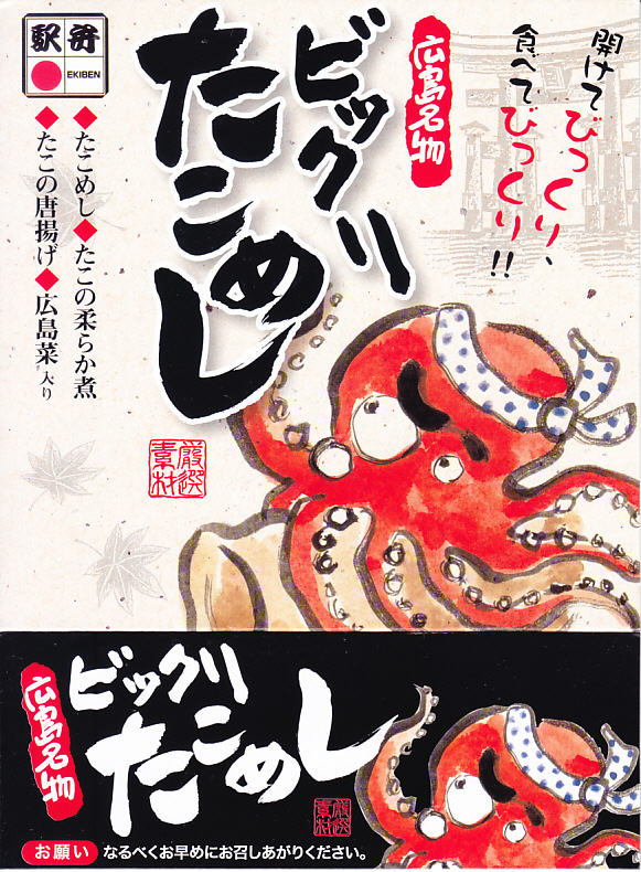 JR時刻表によると2008(平成20)年に1,050円で発売か。正方形の容器にタコ飯を詰め、タコ煮のスライスとタコ天を貼り、錦糸卵とギンナンで彩り、煮物と広島菜油炒めを添える。塩味が濃すぎてビックリするタコ飯だった。駅弁のタコ飯は、駅弁屋の営業エリアでは東隣となる三原駅が元祖となる。価格は2014年4月の消費税率改定で1,080円、2023年時点で1,150円。