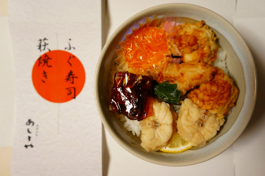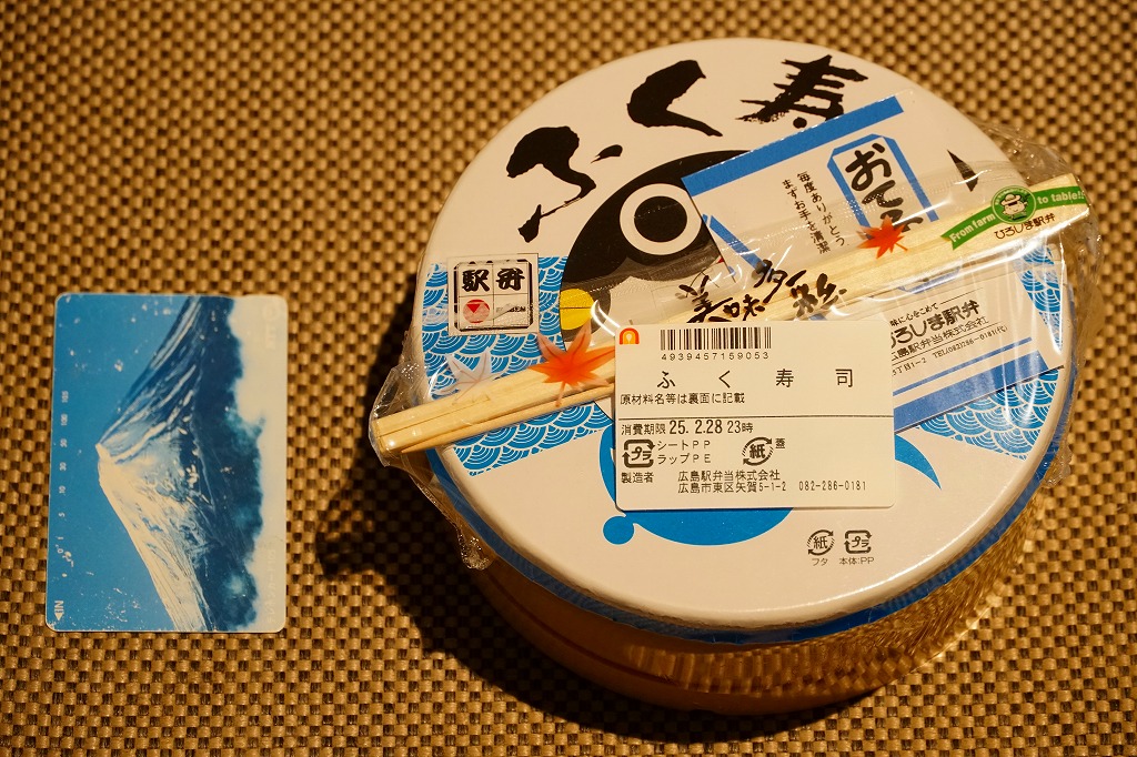 昔と比べればフグの薄いフグ飯に思えても、広島とフグが結び付かなくても、もはや下関駅や新下関では売られなくても、フグの唐揚げと皮という駅弁で見慣れない食材を主題にした、個性的な駅弁としてこうして催事にも出てくる。下関駅で寿司よりうまくて楽しかっためしは引き継がれず、残念に思う。価格は2015年時点で870円、2023年時点で1,200円、2025年時点で1,300円。