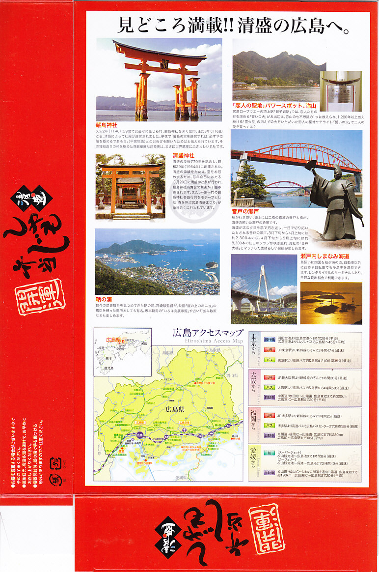 2012年のNHK大河ドラマ「平清盛」の放送開始を前に、2011(平成23)年11月18日に販売を開始。平清盛にちなんだ風景写真3点と、大河ドラマ「平清盛」広島県推進協議会が定めたイメージキャラクター「ひろしま清盛」のイラストなどを印刷したふたを使用する。正方形9区画の中身は、赤飯、タコ飯、アナゴ飯、じゃこ飯、スズキ塩焼きと玉子焼、イワシ南蛮漬、ゴボウやコンブなどの煮物、鴨やネギなどの焼き物、サツマイモや煮豆などの甘味。