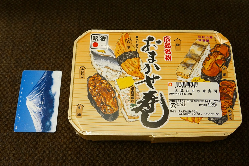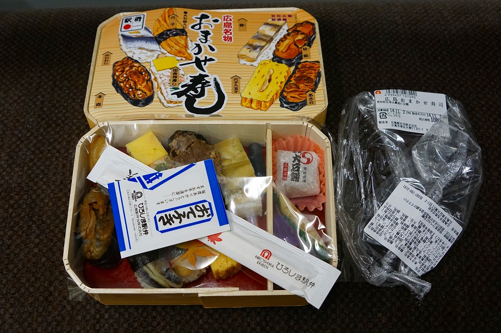 駅弁でのもぐり寿司といえば、山陰本線松江駅「大和しじみのもぐり寿司」が有名で、広島にももぐり寿司があるとは思わなかった。価格は2001年の購入時で870円、2015年時点で905円、2017年時点で880円。2018年頃までの販売か。2021年に1,080円でリニューアル再発売したものの、同年で終売か。