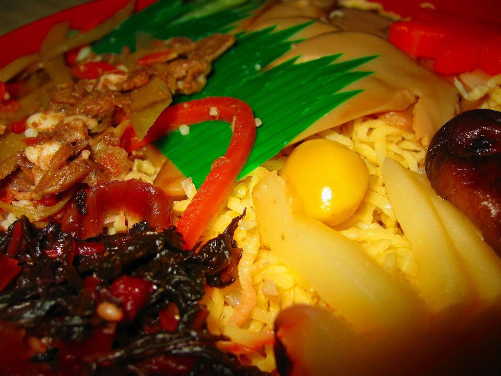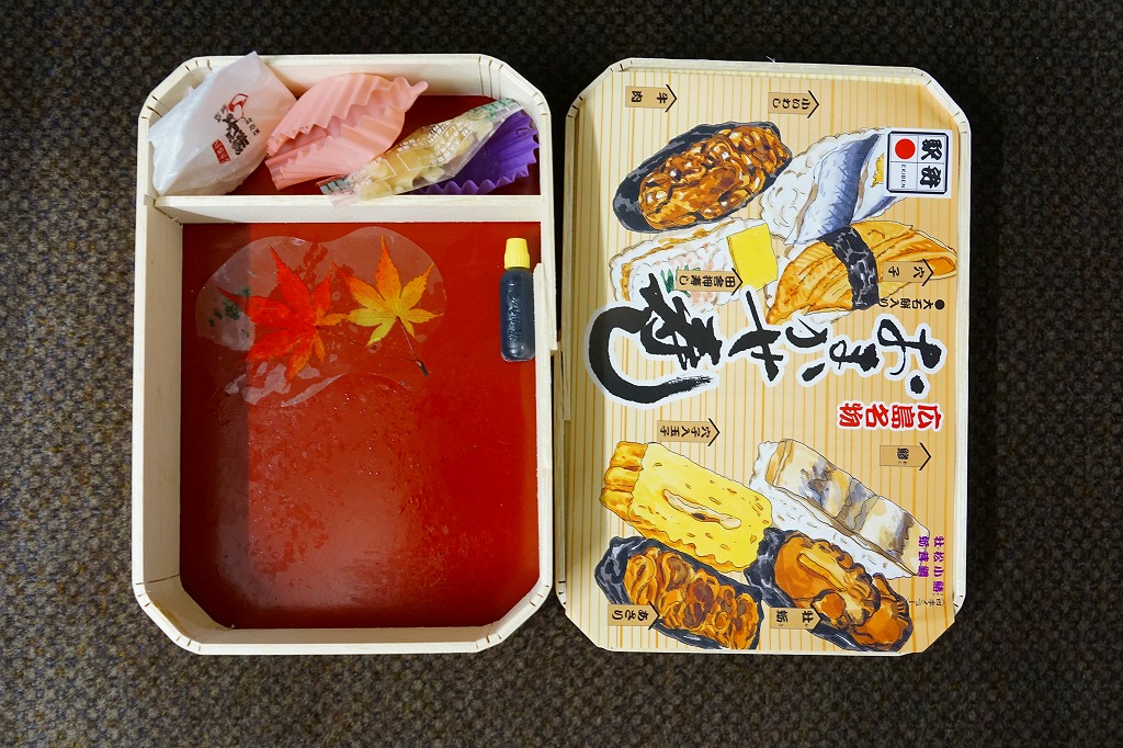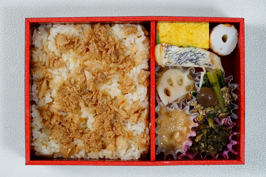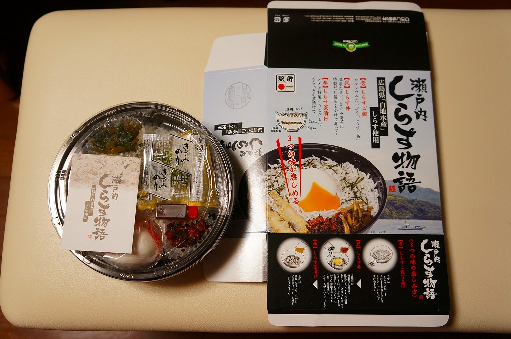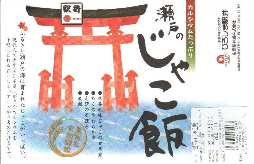 1984(昭和59)年に発売。長方形のボール紙製容器の中に赤いトレーが入る。中身は酢飯に瀬戸内の小魚やえびや山菜がもぐり、上にはエビやイクラや穴子や椎茸などが載るもの。全体の分量もそうだが、特に具の量が少なく、値段を考えてもやや寂しい内容。普通の幕の内弁当か、冬ならば「しゃもじかきめし」を買いたい。