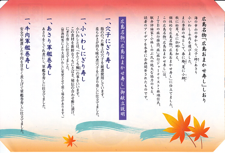 個々の食材の個性とサイズが大きく、風味も雰囲気も良い駅弁。しかし箸袋に「仕出し料理 あじろや」と脱駅弁のブランド名を掲げていたり、普段の広島駅での弁当販売状況を見ると、この調製元は駅弁への関心が薄いのではないかと思われてならない。現在は売られていない模様。