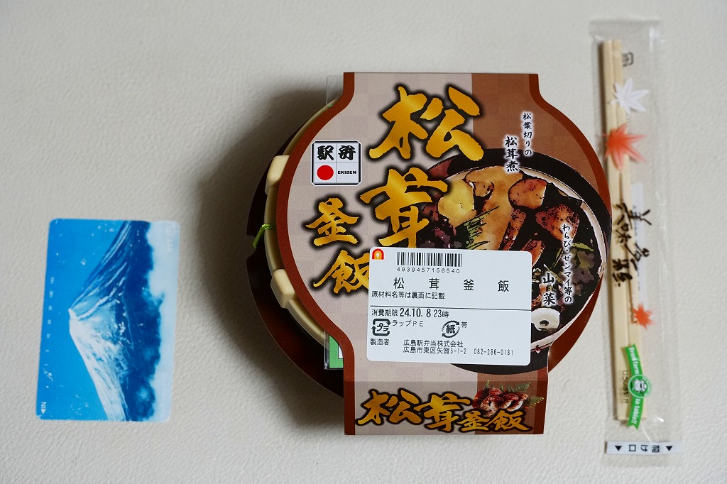 釜飯駅弁向けのプラ容器に炊込飯を詰め、松茸の松葉切りを3本載せて、山菜、くり、にんじん、広島菜漬も載せる。2010年代には少なくなったと思うが、秋冬のスーパーの駅弁大会でよく見るタイプのマツタケ駅弁にみえる。それらがマツタケを手指の大きさのスライスで数切れ入れるくらいであるのに対し、こちらは傘の形が分かるカットでたっぷり。商品名やイメージイラストだけでなく視覚で、マツタケがちゃんと感じられた。煮汁をたっぷり吸っていて、香りを感じるほどではない。あと10年も経てば香る松茸駅弁になるかどうか。