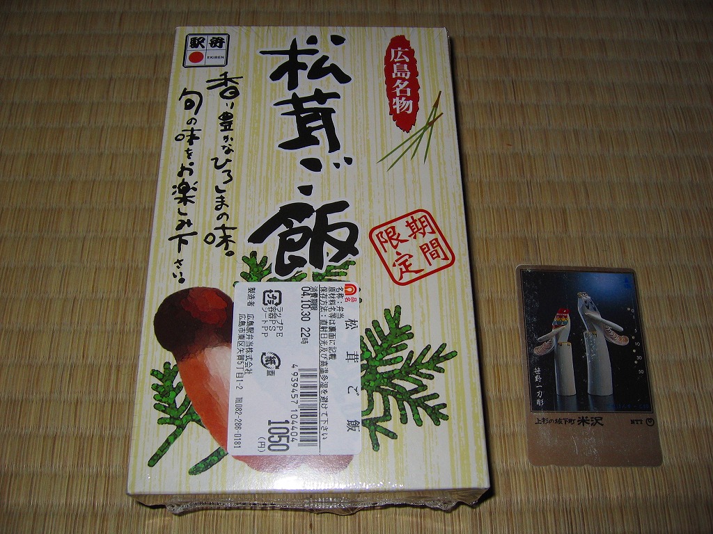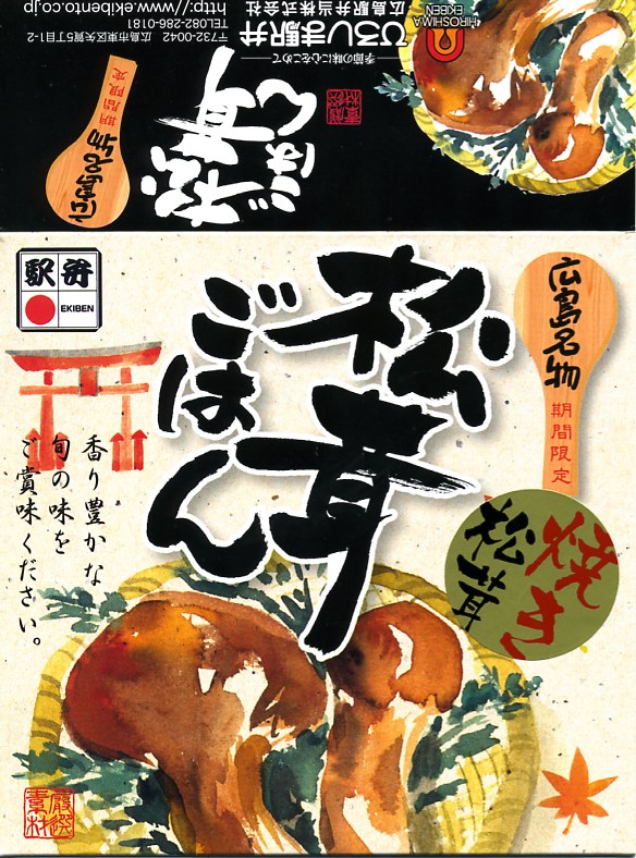 広島駅の秋季限定の駅弁。2004年の購入当時、ネット上の「駅弁図鑑西日本版」では「時価」と恐ろしい表現になっていたが、同じく昔の資料で時価とされた有名駅弁「しゃもじかきめし」と同じく、1,050円に収まるのだと思う。薄く小さい長方形の容器にボール紙でふたをして、広島駅弁らしくラップで密封する。中身はそのまんま、鶏照焼を添えた松茸御飯。1ミリ厚5切れの松茸で香りと食感をギリギリ確保していた。価格は2004年の購入時で1,050円、2012年時点で1,000円、2015年時点で1,080円。2010年代は催事専用で売られた模様。2018年頃に終売か。