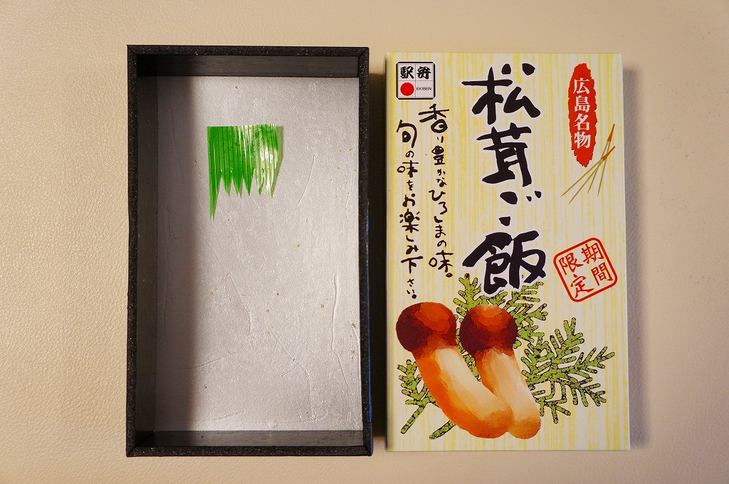 上記の駅弁「広島名物松茸ご飯」のリニューアル品か。正方形の容器に透明なふたをして、松茸と駅弁の名前と大鳥居をしゃもじを描いたボール紙のパッケージにはめる。中身はマツタケの混ぜ御飯の上にマツタケ、クリ、ニンジン、鶏照焼、山菜、広島菜漬を載せるもの。マツタケは頭から4分割して6切れ、つまり1本半も入る豪華版。パッケージのシール「焼き松茸」ではなく食品表示ラベル「松茸煮」は、香りや食感こそスライスのものと変わらない程度だが、その代わりに上げ底の松茸御飯が良い香りを出していた。