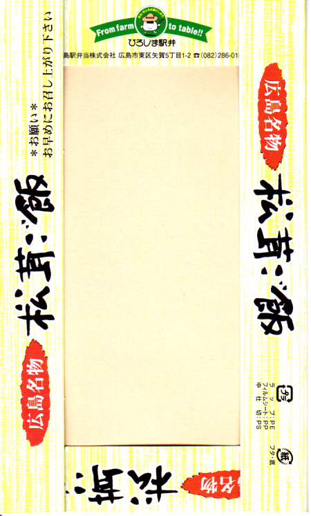 2005(平成17)年の発売か。この形状ははたして釜なのかとも思う、赤く浅いプラ製釜飯容器に割り箸を置いて輪ゴムでしばり、商品名と中身写真を載せた紙枠にはめる。中身は牛肉細切れも載った松茸釜飯。広島名物でもなんでもないと思う、特徴なき釜飯風弁当。現存しない模様。