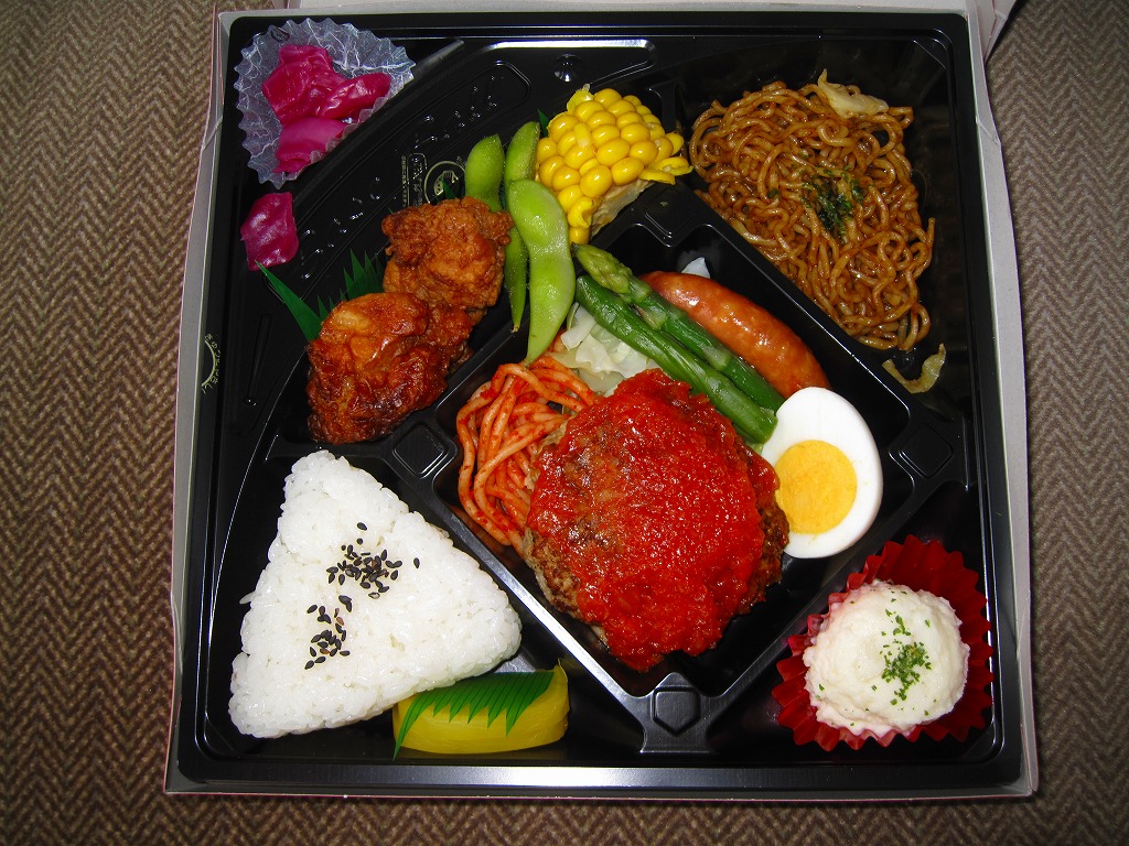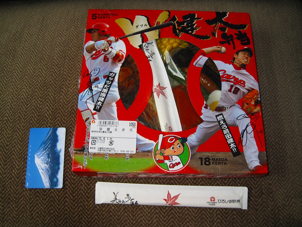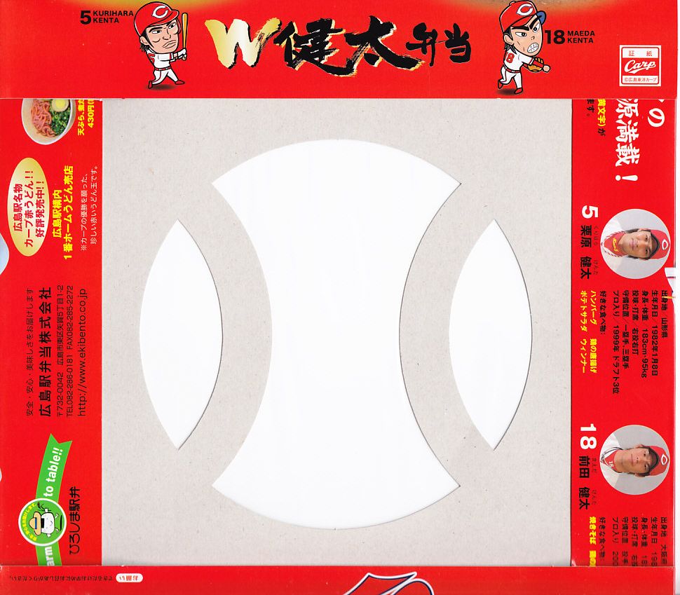 2009(平成21)年3月19日に発売し、2010年版もこのように無事に発売された、プロ野球の選手にちなんだお弁当。広島東洋カープの前田健太投手と栗原健太内野手の写真を掲載した赤く大きな専用紙箱を使用、黒いスタジアム型トレーに収まる中身は、三角形の型押し飯、焼きそば、ハンバーグ、鶏唐揚、スパゲティ、ウインナー、枝豆、とうもろこし、ゆで卵、ポテトサラダ、紫キャベツの酢の物、たくあんなど。