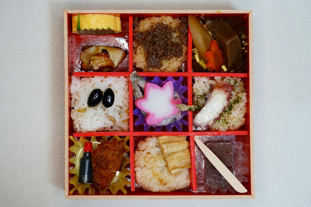中身は「広島熟成どりの照り焼き」と玉子焼、「広島和牛のそぼろ飯」、「神石こんにゃく煮」とごぼうともみじ型にんじん、「郷土の味もぶり寿司」、「広島県産小いわし南蛮漬」ともみじ型かまぼこ、「郷土の味タコ飯」、「広島県産牡蠣フライ」とソース、「郷土の味あなご飯」、「広島県産柿羊羹」。