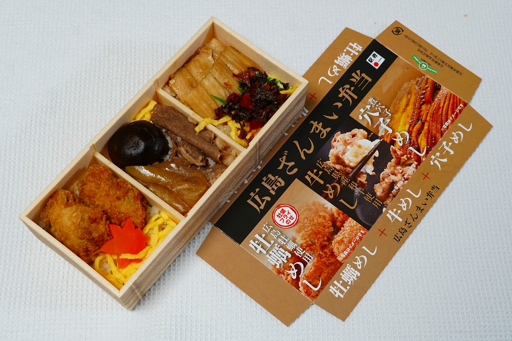 秋冬の駅弁大会シーズンに向けた、2014(平成26)年秋の新商品か。ふたに「牡蠣めし」「牛めし」「穴子めし」と書かれるとおり、横に細長い容器の3区画に、かき飯をカキフライ2個で覆い錦糸卵とニンジンを添える牡蠣めし、茶飯を牛すき焼きとシイタケと錦糸卵で覆う牛めし、茶飯を煮穴子と錦糸卵と広島菜漬けで覆う穴子めしが入っていた。1食分で3食を楽しめる、便利な駅弁。2019年の終売か。