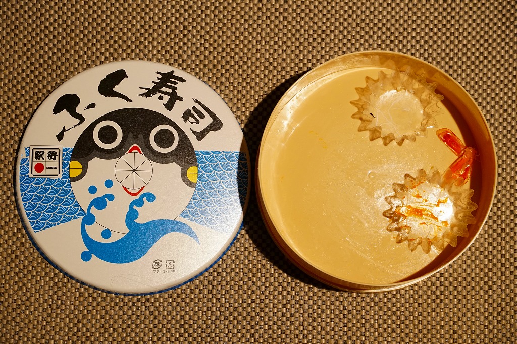 1989(平成元)年に下関駅などで発売し、現地や催事で名物だった下関駅弁「ふく寿司」。2010(平成22)年の駅弁屋の廃業により新山口駅の駅弁屋に引き継がれ、その駅弁屋も2015(平成27)年に廃業したためさらに広島駅の駅弁屋に引き継がれた。その頃はスーパーやデパートの催事では下関駅や新山口駅の駅弁として売られたが、2020年代には広島駅の駅弁と紹介されるようになったと思う。