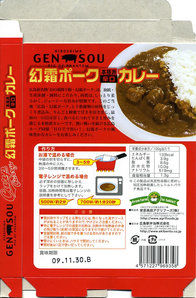 上記駅弁群の関連商品としてのレトルトカレーで、2008(平成20)年7月1日に発売。プロ野球「広島東洋カープ」のマスコットキャラクターと中身のイメージ写真などを印刷したパッケージに、無地銀色のレトルトパックを詰める。中身は豚肉とルーのみのポークカレー。通信販売対応商品。