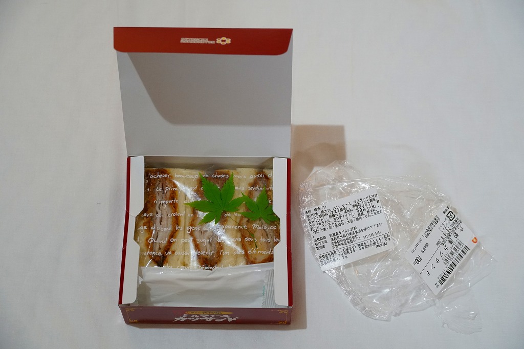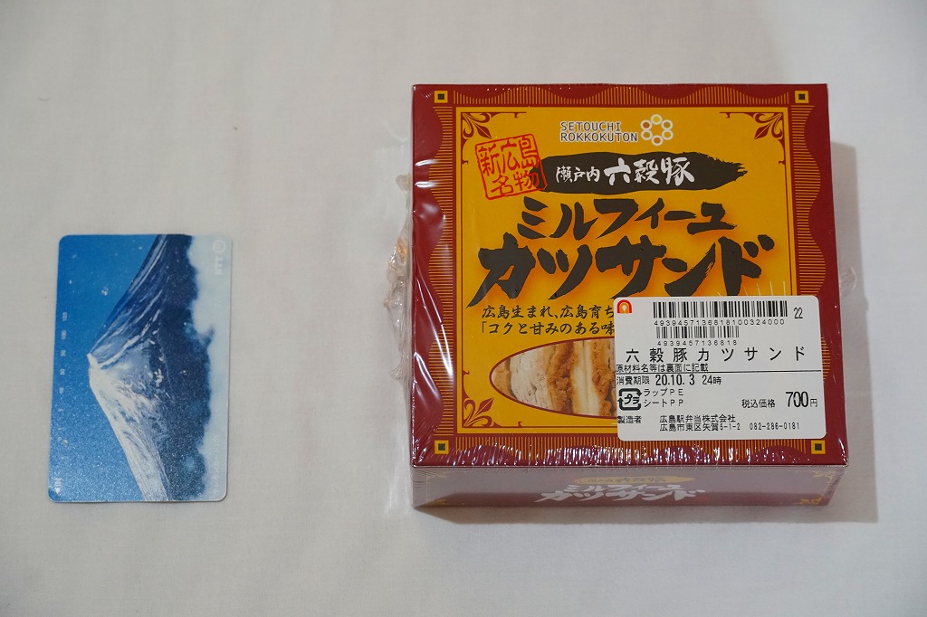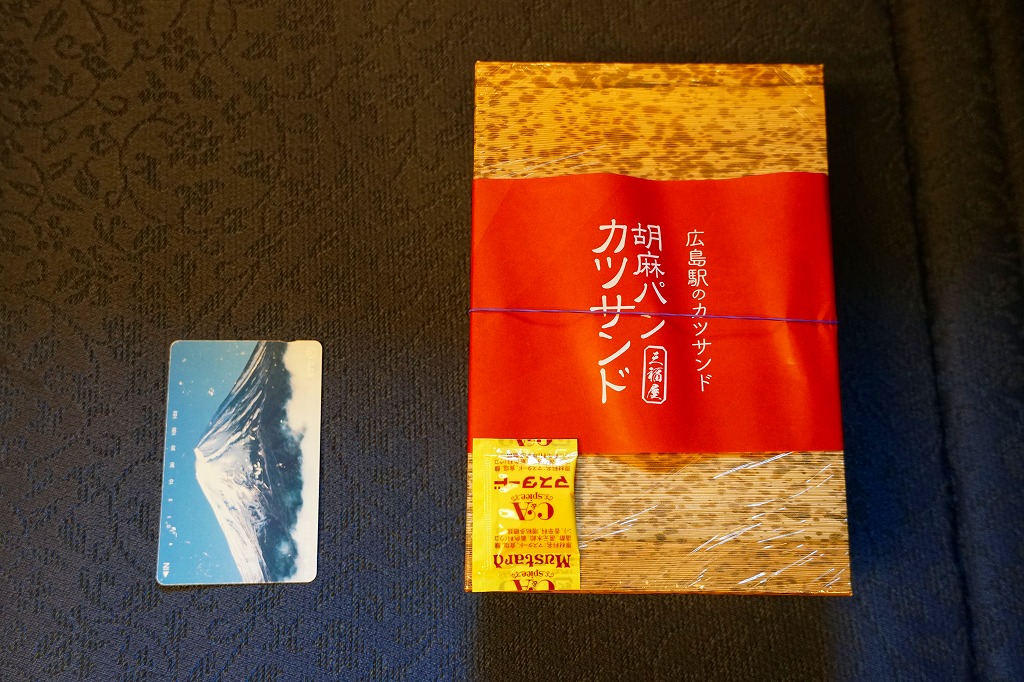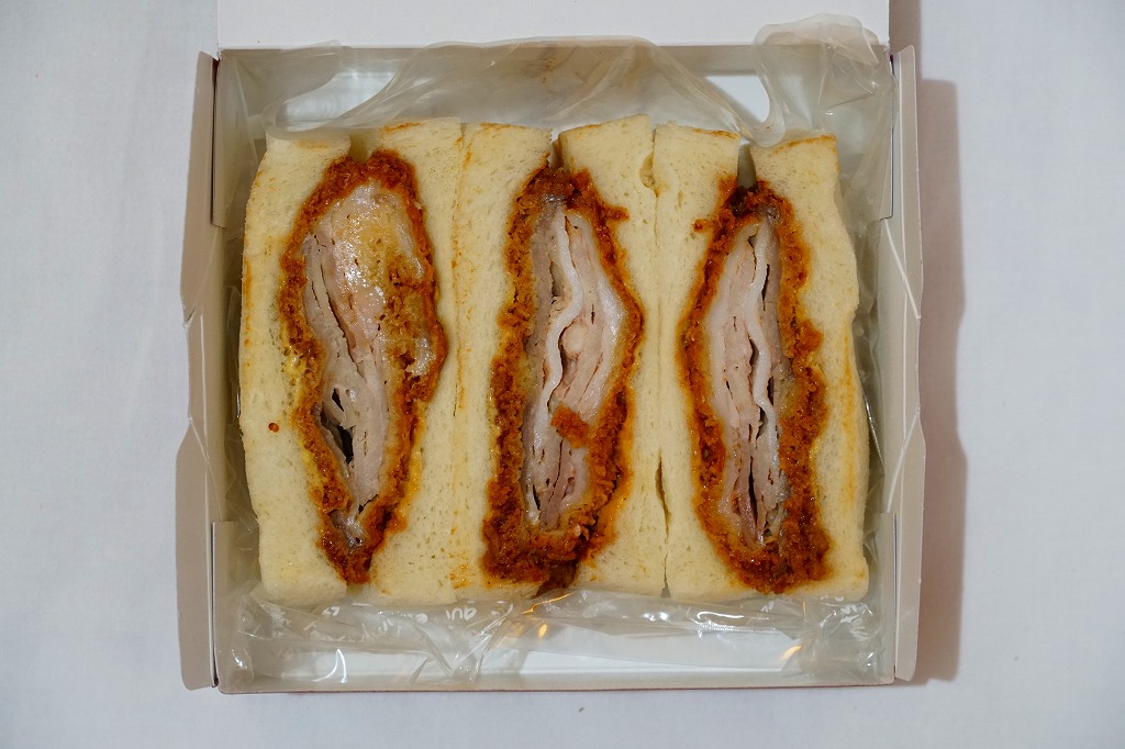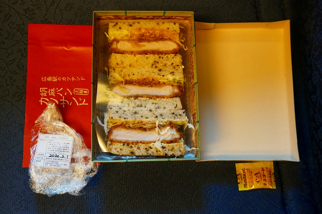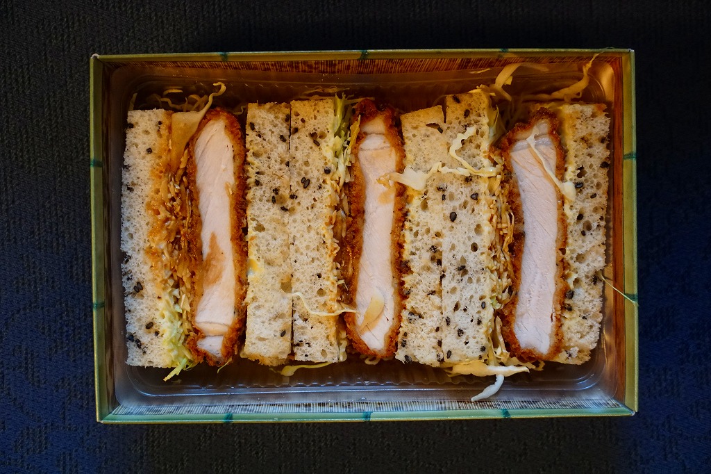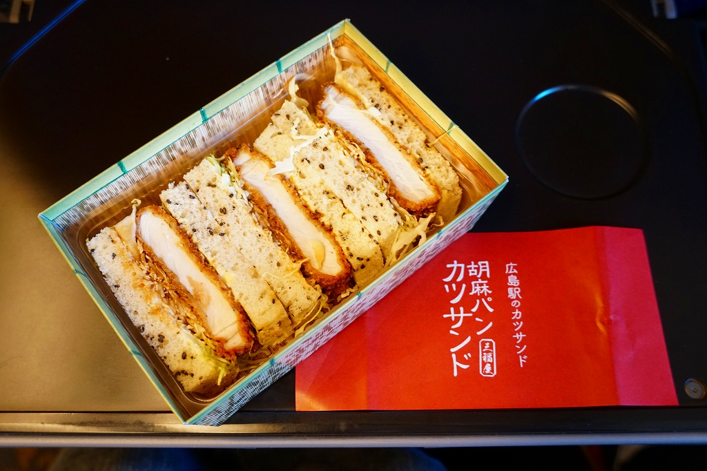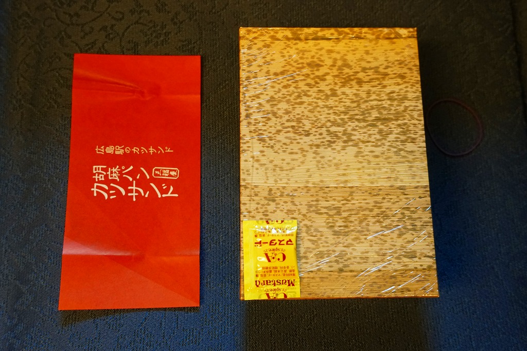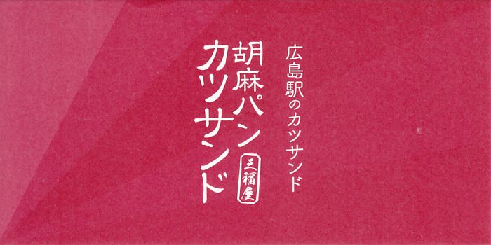 広島駅の駅ビルで買えたサンドイッチ。「広島駅限定」を名乗るため、駅弁と同列で収蔵した。駅弁でもよく使われる竹皮柄の紙箱に、「広島駅のカツサンド」とも記した赤い掛紙を巻く。透明なトレーに収まる中身は、商品名のとおり、トンカツのソース漬けと千切りキャベツを胡麻パンで挟んだ、カツサンドが3切れ。パンの個性が風味を彩る。調製元は広島エリアで様々な飲食店を経営する企業。