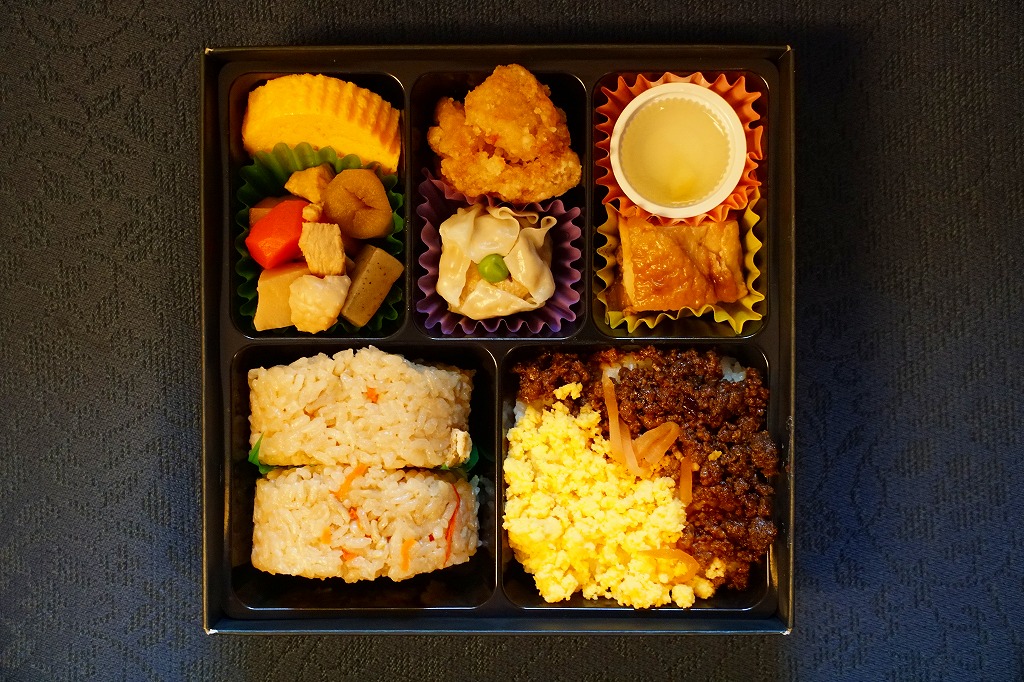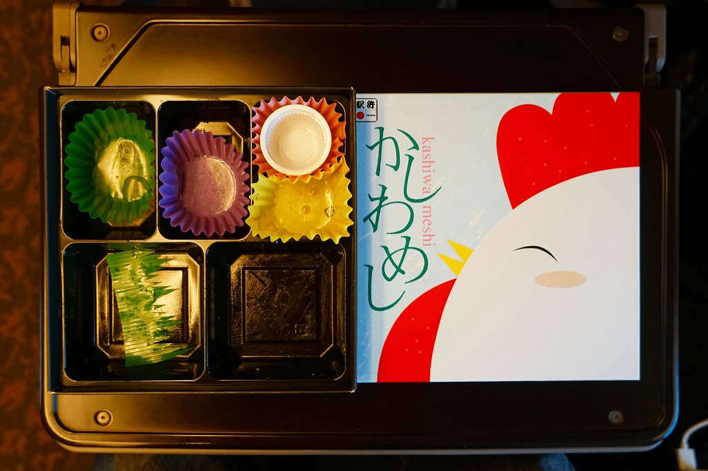 中身は新山口駅弁の頃とはまるで異なり、鶏肉の五目飯を使うおむすび2個、白飯を鶏と卵のそぼろで覆うもの、玉子焼、煮物、鶏唐揚、焼売、鶏照焼、ミニゼリー。九州北部や山口県で駅弁や郷土料理になる「かしわめし」とは味も見た目も似付かない、鶏が豊かなお弁当。2021年までの販売か。調製元は2018年末に博多駅のかしわめしを引き継いだ。