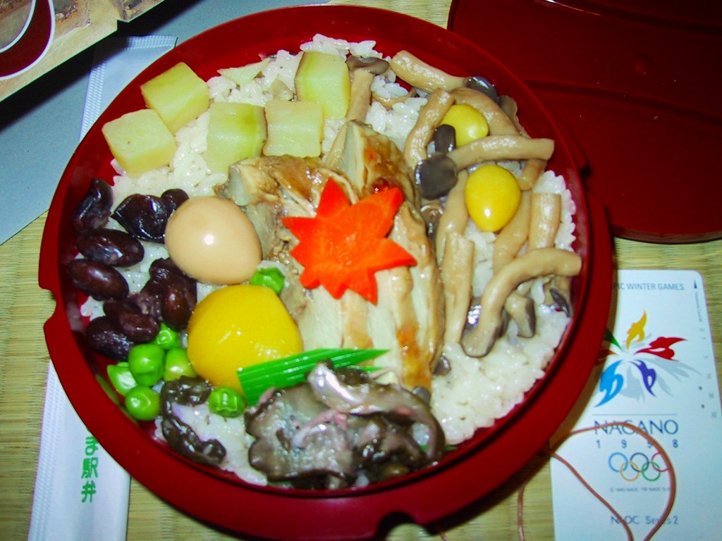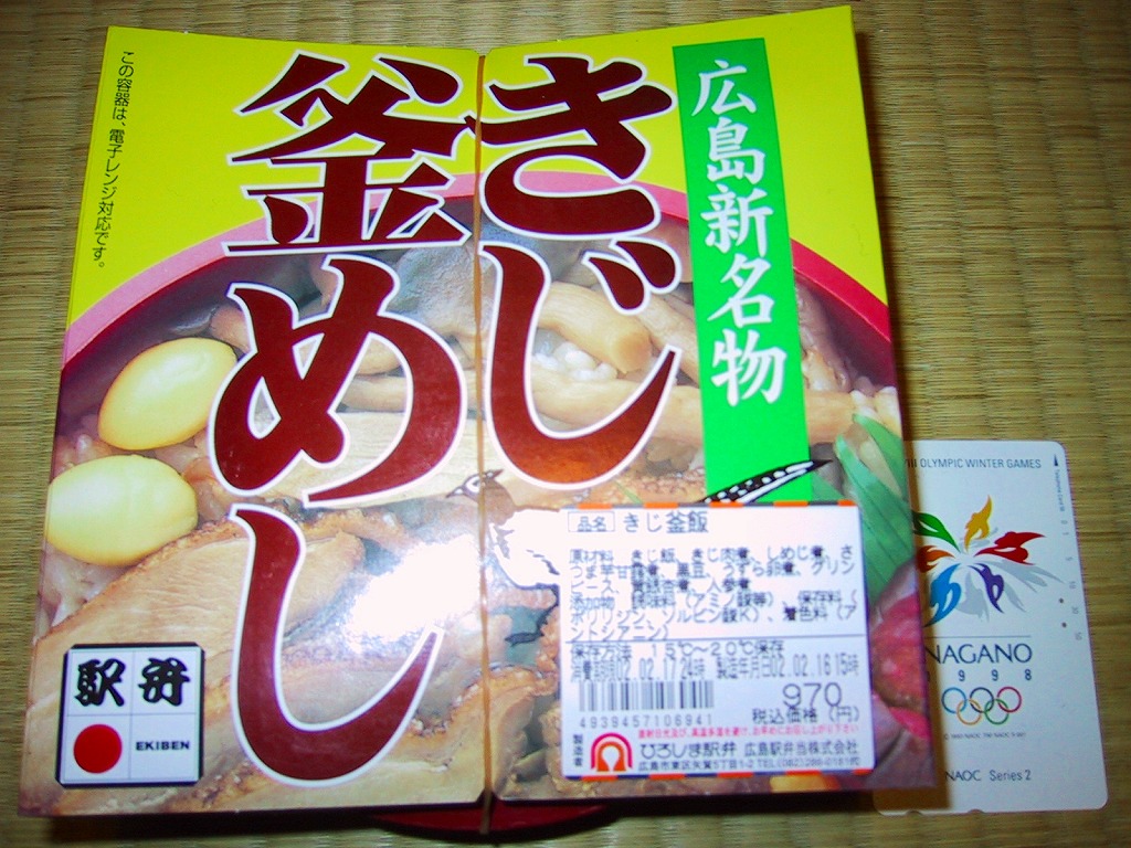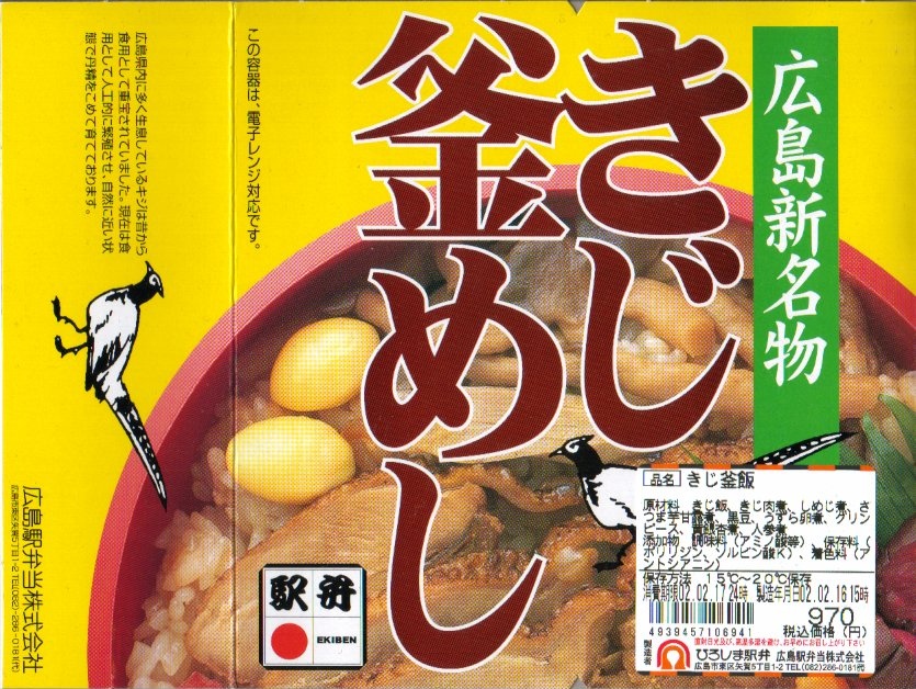 2000(平成12)年頃の発売。プラスティックの釜を使用し、中身はキジ御飯の上の中央にキジ肉煮を配置、周囲に薩摩芋・栗・黒豆・シメジ・うずら卵などを配置するもの。栗と薩摩芋がかなり甘い点(私は好きだが)を除き、飯も鳥もしゃきっとした味と食感が楽しめる。現在は売られていない模様。