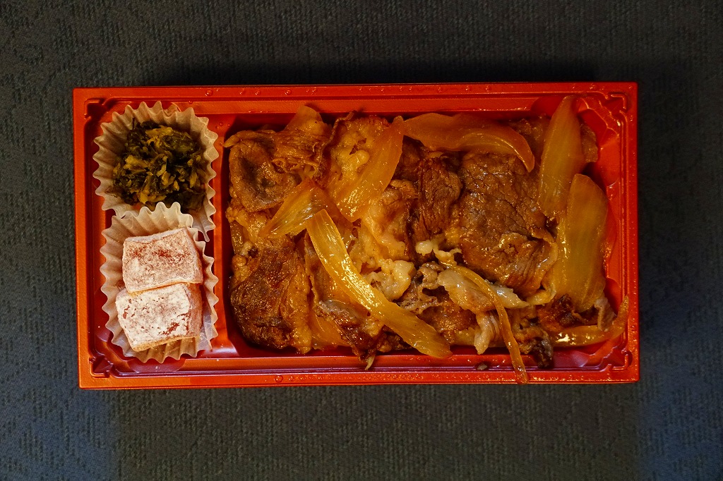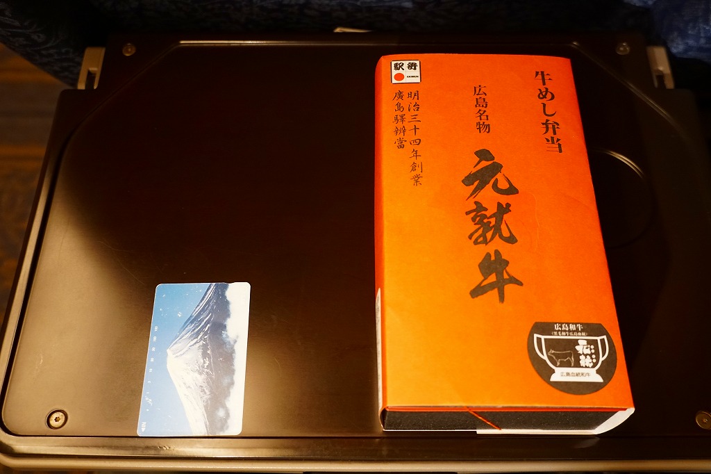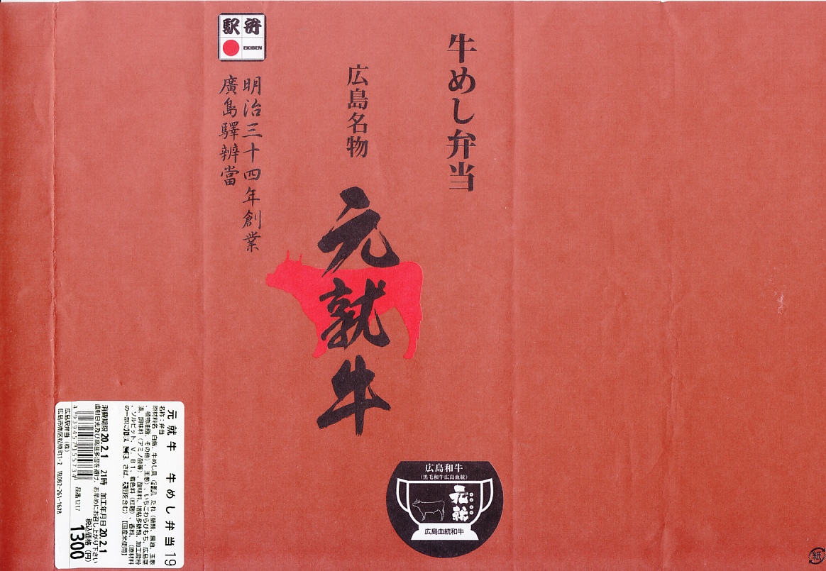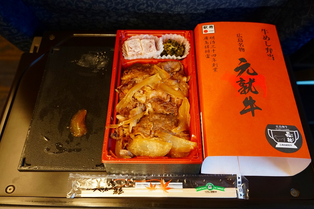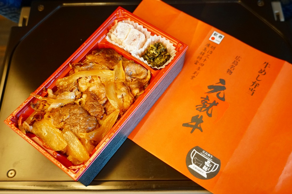 2019(平成31・令和元)年の5月までに発売か。駅弁の名前などを描く、赤くシンプルな掛紙を巻かれた長方形の容器の中身はつまり牛丼で、白御飯をすき焼き肉とタマネギで覆い、広島菜漬といちごわらびもちを添えるもの。牛肉に広島県血統を引き継ぎ県内のみで育てた、牛枝肉取引規格の等級「B−3」以上のブランド牛「広島血統和牛元就」、つまり広島県産牛を使うようだ。1年間ほどの販売か。
