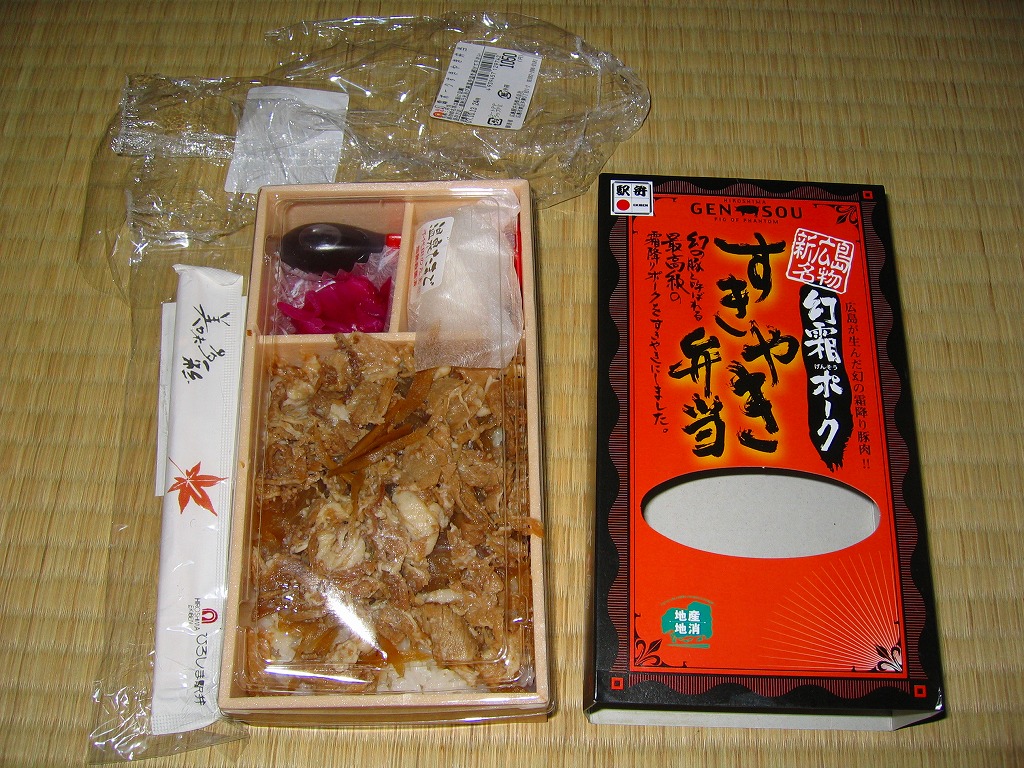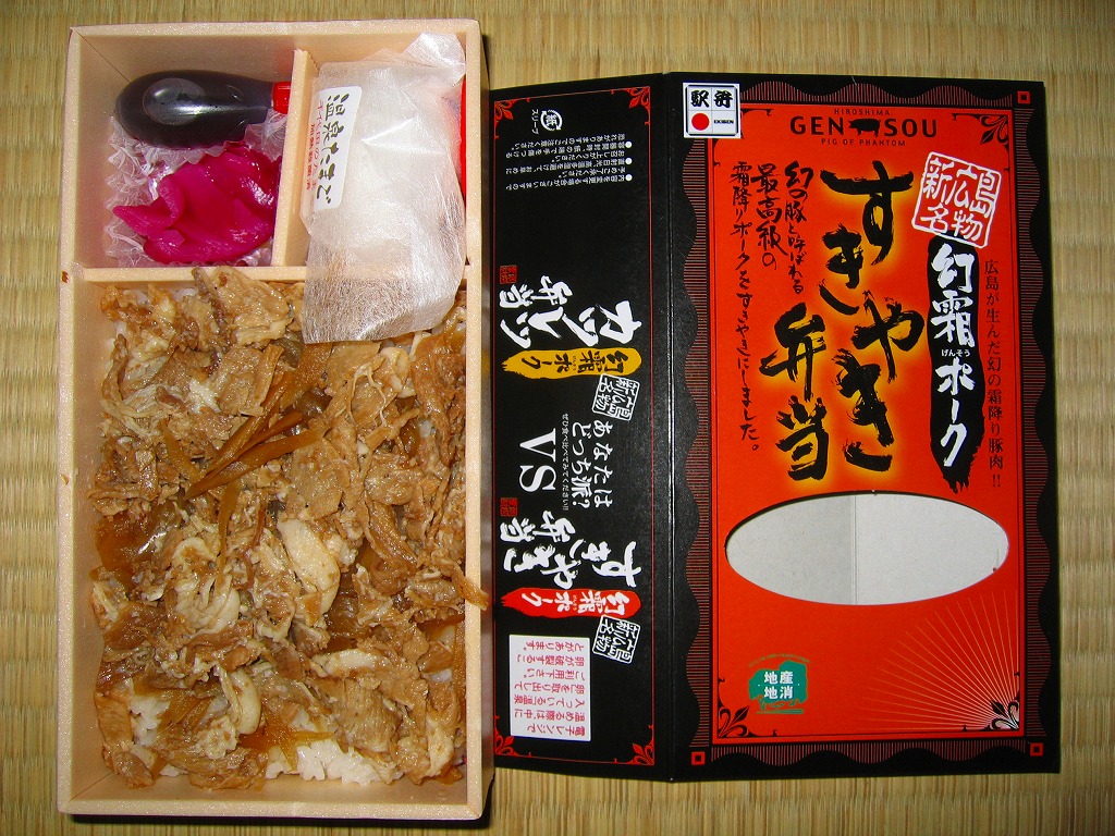 中身は白御飯の上に霜降り豚肉のすき焼きを詰め、温泉玉子をひとつ付け、豚型のタレと紫キャベツの酢の物を添える。豚肉なのにクールに溶ける脂身と柔らかい赤身が心地良い高級豚丼。しかし今のところは、広島と豚肉が結び付かないため、ここのカキ駅弁や他の牛肉駅弁と同じ値段である点に割高感もある。現在は売られていない模様。