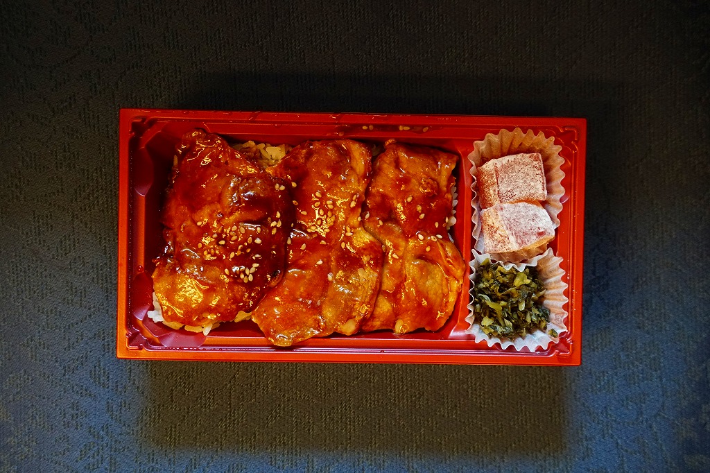 2019(平成31・令和元)年の5月までに発売か。駅弁の名前などを描く、黄色くシンプルな掛紙を巻かれた長方形の容器の中身はつまり豚丼で、白御飯をタレをたっぷりまとう3枚の豚肉で覆い、広島菜漬といちごわらびもちを添えるもの。豚肉に広島県の庄原地区の生産者4戸が2013年頃からつくる、飼料に牡蠣殻粉末を混ぜて育てた広島食肉市場肉豚出荷組合のブランド豚「瀬戸もみじ」を使うようだ。1年間ほどの販売か。