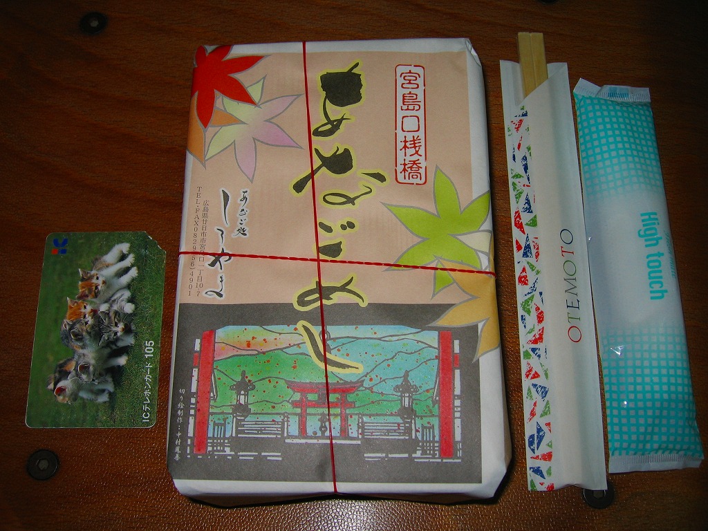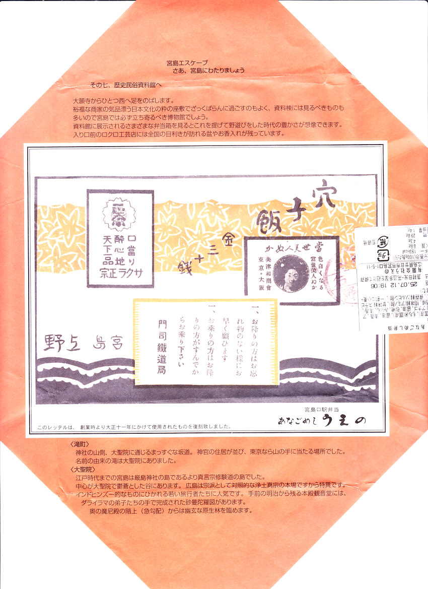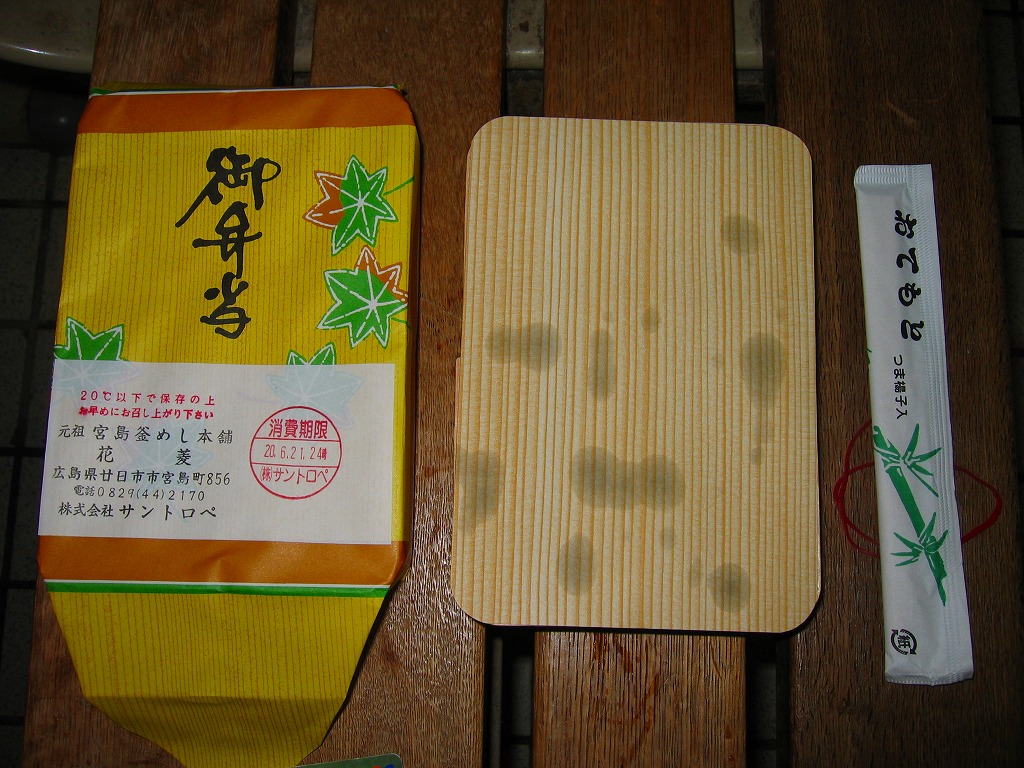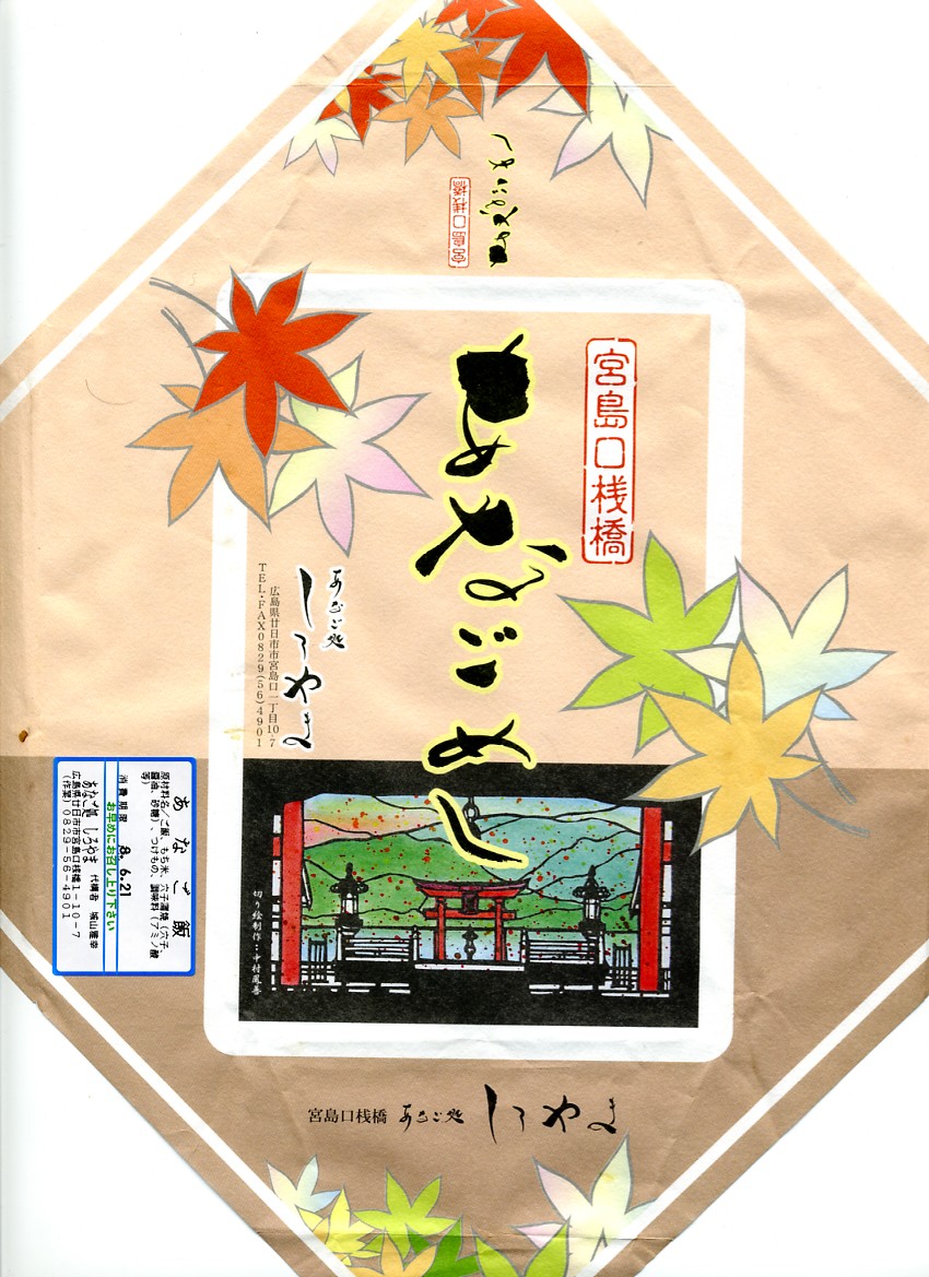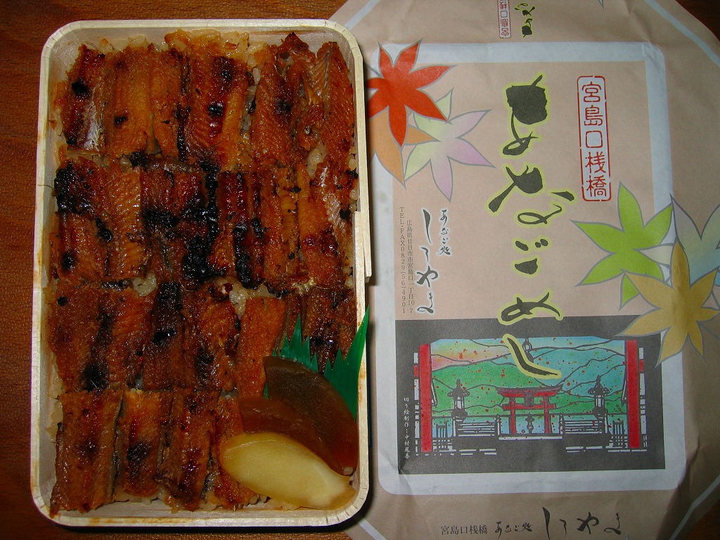 宮島で見つけた、街弁版あなごめし。2008年の訪問時で、宮島の島内で3軒、宮島口の港と駅の間で駅弁屋を含め2軒、あなごめしの弁当での販売があった。細長い経木折をラップで丸ごと包み、ボール紙でふたをして包装紙で包み、商品名を書いた掛紙をかけて輪ゴムで留める。中身は宮島名物あなごめし。蒲鉾のような食感で穴子の臭みが個性的。価格は2008年の購入時で1,300円、同じ包装紙と掛紙を使い分量が多い「(大)」は1,700円。2023年時点で、2,000円と2,300円。