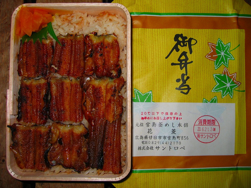 宮島口で見つけた、街弁版あなごめし。訪問時には宮島の島内で3軒、宮島口の港と駅の間で駅弁屋を含め2軒、あなごめしの弁当での販売があった。駅弁のような経木折に木目柄のボール紙でふたをして、容器に比して大きめの掛紙で包む。中身は宮島名物あなごめし。佃煮のような風味でおこげもある強めの味。価格は2008年の購入時で1,370円、2023年時点で2,160円。