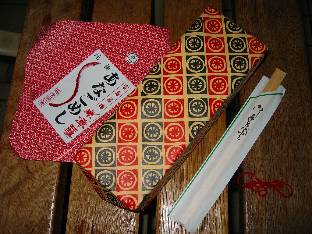 ふたから底まですべて木製の経木折を、過去に使用された12種類の絵柄をランダムに使う掛紙で包む。この掛紙は「その九」版。中身は餅米を1割混ぜてアナゴの出汁で炊いた御飯の上に、素焼きした後にタレに漬けて焼くことを3回繰り返した白焼き穴子を敷き詰め、タクアン、奈良漬、ガリを添えるもの。出来立ての暖かい弾力のある味よりも、数時間から半日程度常温で放置してなじませた締まりのある味のほうが良いとされる。
