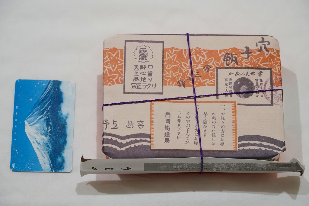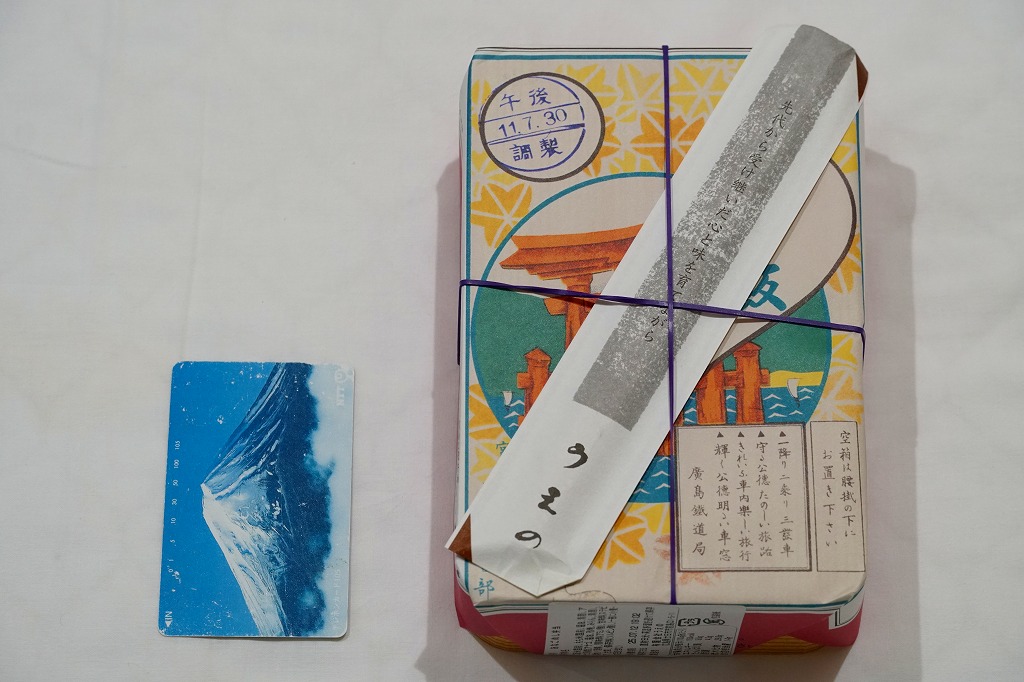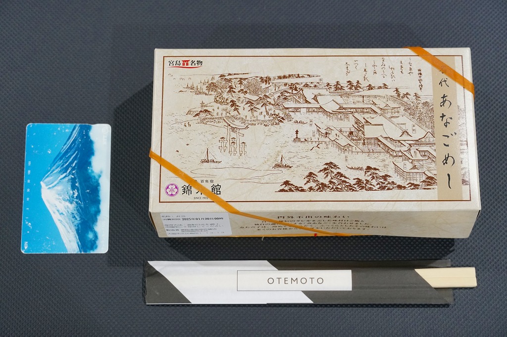 宮島の旅館を名乗るあなごめし。現地でなく、大阪梅田の阪神百貨店で購入。あとで調べると、旅館の紹介に穴子飯はなく、このブランドでネット通販や催事出店を行い、宮島でこの商品を売ることはないらしい。経木折にタレ御飯を詰め、錦糸卵と薄くて柔らかい焼アナゴで覆い、漬物を添えて、宮島神社を描いた掛紙でふたをする。味はどちらかといえば、宮島の島内や港で買ったり食べられる歯応えのあるものではなく、広島駅や福山駅の駅弁のように溶けるような柔らかさのあるものであった。もし2025年1月に阪神百貨店の駅弁大会があれば、そこに出店しただろうか。