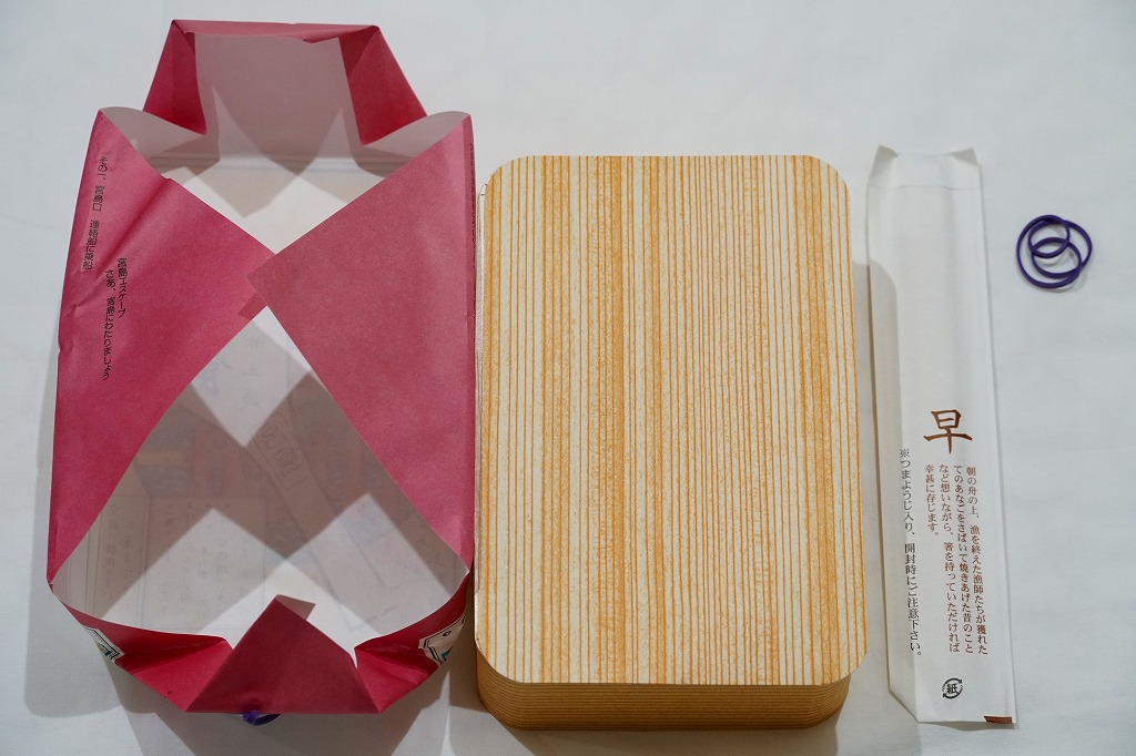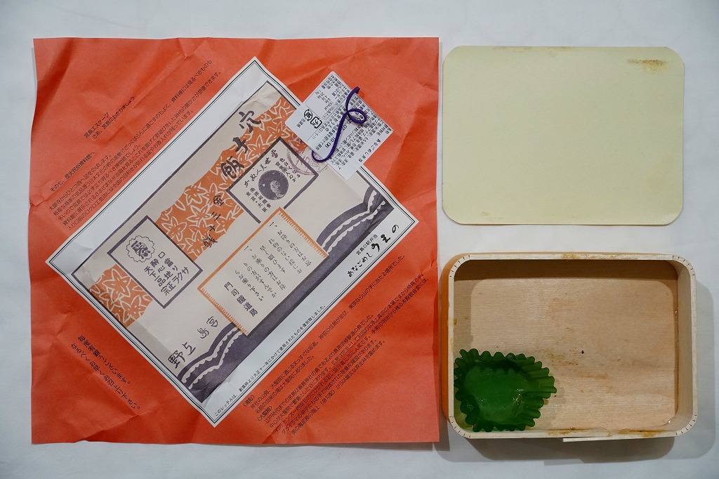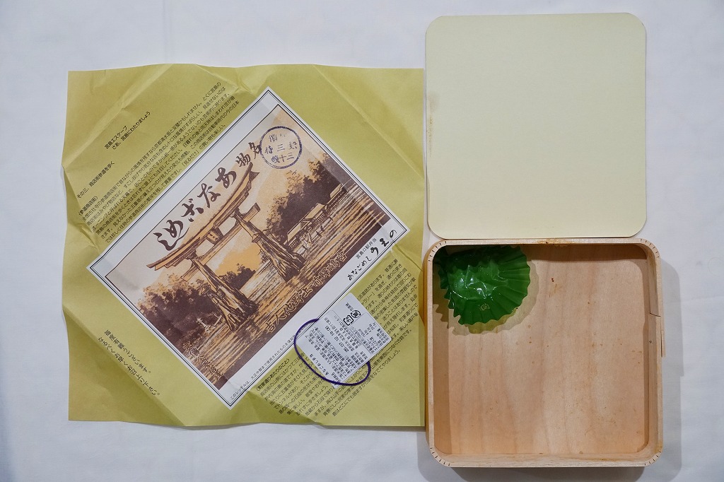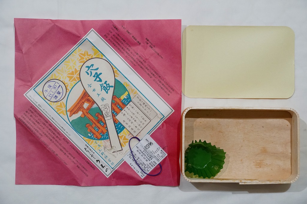 宮島口駅弁のあなごめしの「(小)」版で、2019年に発売か。これは駅でも駅弁の輸送販売や実演販売では買えず、宮島駅前の調製元で繁忙期を除き注文できる。作り置きはしないようで、店頭の弁当窓口で注文して、しばし待つ。掛紙と中身は駅弁のものとまったく同じ。長方形の経木折が2割ほど小さくなった感じで、内容量もそれだけ減り、価格は1割引き。