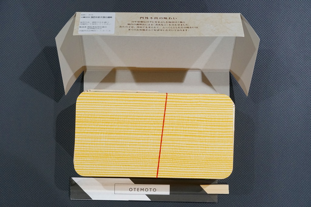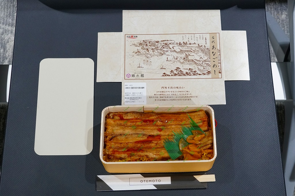 宮島口駅弁のあなごめしの「(大)」版で、2019年に発売か。これは駅でも駅弁の輸送販売や実演販売では買えず、宮島駅前の調製元で繁忙期を除き注文できる。作り置きはしないようで、店頭の弁当窓口で注文して、しばし待つ。掛紙と中身は駅弁のものとまったく同じ。経木折が少し大きく正方形になり、内容量が3割ほど増えた感じで、価格は2割増し。