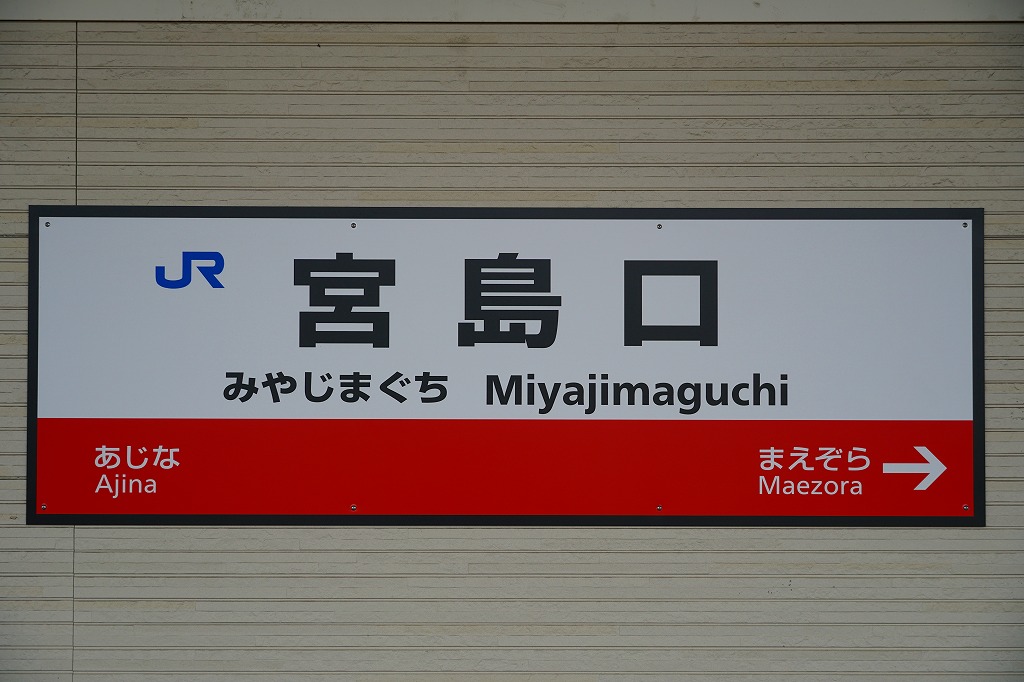 広島駅から山陽本線で約30分。国重要文化財で世界文化遺産の厳島神社を抱える、古来から参拝客や観光客を集め日本三景に数えられる宮島への玄関口として、駅が設けられ、鉄道連絡船やフェリーが発着する。駅弁は明治時代からの駅弁屋「うえの」が「あなごめし」1種類のみを百年以上売り続ける。1897(明治30)年9月25日開業、広島県廿日市市宮島口一丁目。