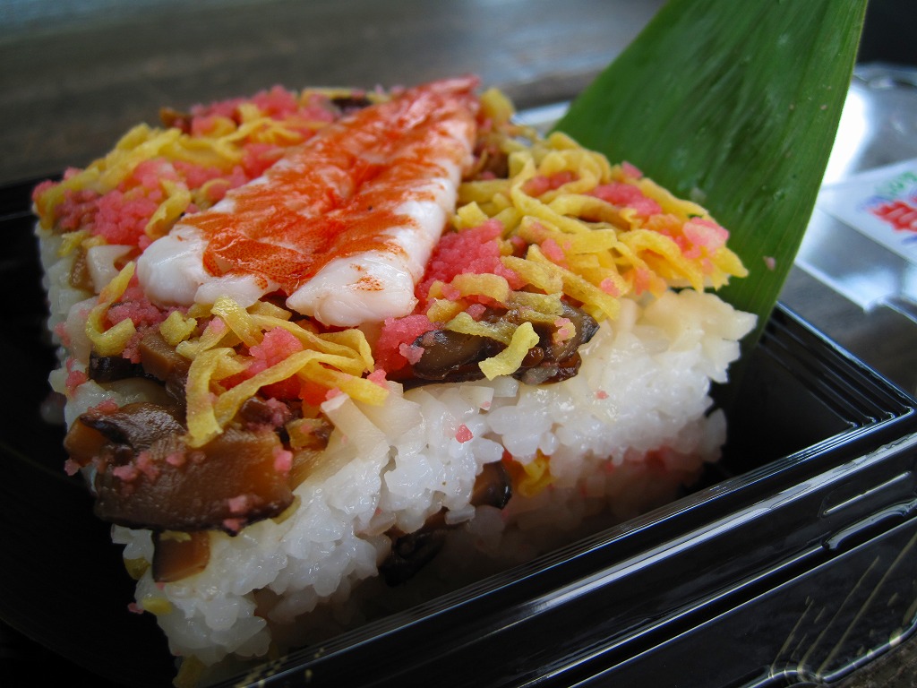 新岩国駅のキヨスクで売られていた、山口県岩国の郷土料理「岩国寿司」のお惣菜。御飯に合わせ酢を混ぜて敷き、シイタケやエビや錦糸卵や魚肉などを散らし、また酢飯を敷いて具を散らし、これを繰り返した上でまとめて押し潰して切り分けるサンドイッチ。新潟県の上越地方や長崎県の大村でも見たような、甘めな積層ちらし押寿司。1,050円のものも売られていた。