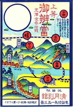 おそらく1930年代のものと思われる、昔の阿波池田駅弁の掛紙。掛紙では池田駅と略され、鉄道路線の俯瞰図に祖谷や歩危や箸蔵や琴平のような、今も通じる観光地の名前を刻む。
