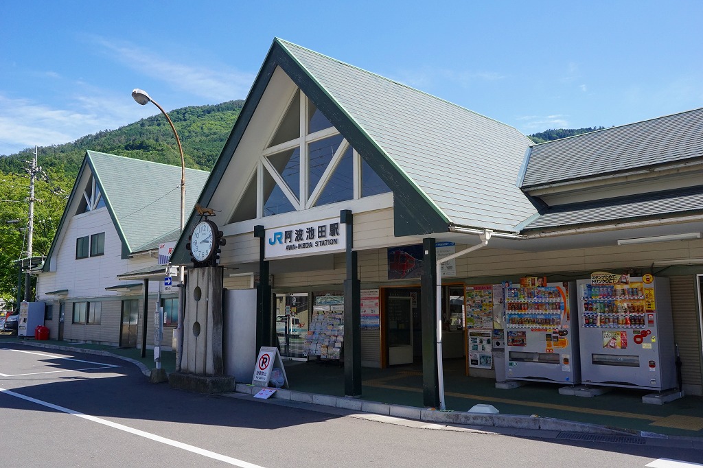 徳島県三好郡池田町は、1980年代に甲子園の高校野球で一世を風靡した池田高校の地元。いわゆる平成の大合併により、2006年3月に三好市(みよしし)の一部となった。大正3年の開業時からの駅舎は、JR四国が瀬戸大橋で儲けていた頃に全駅改装の掛け声で1990年4月にリニューアル。