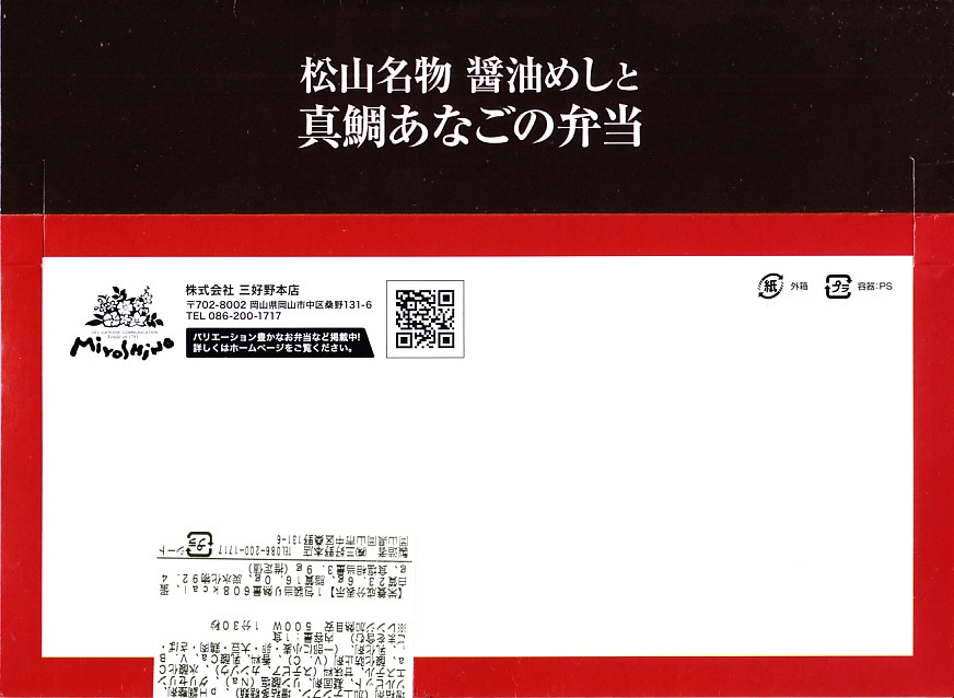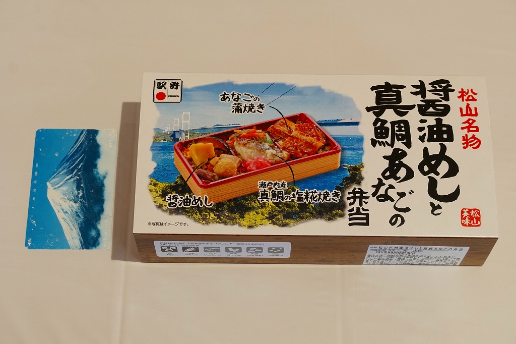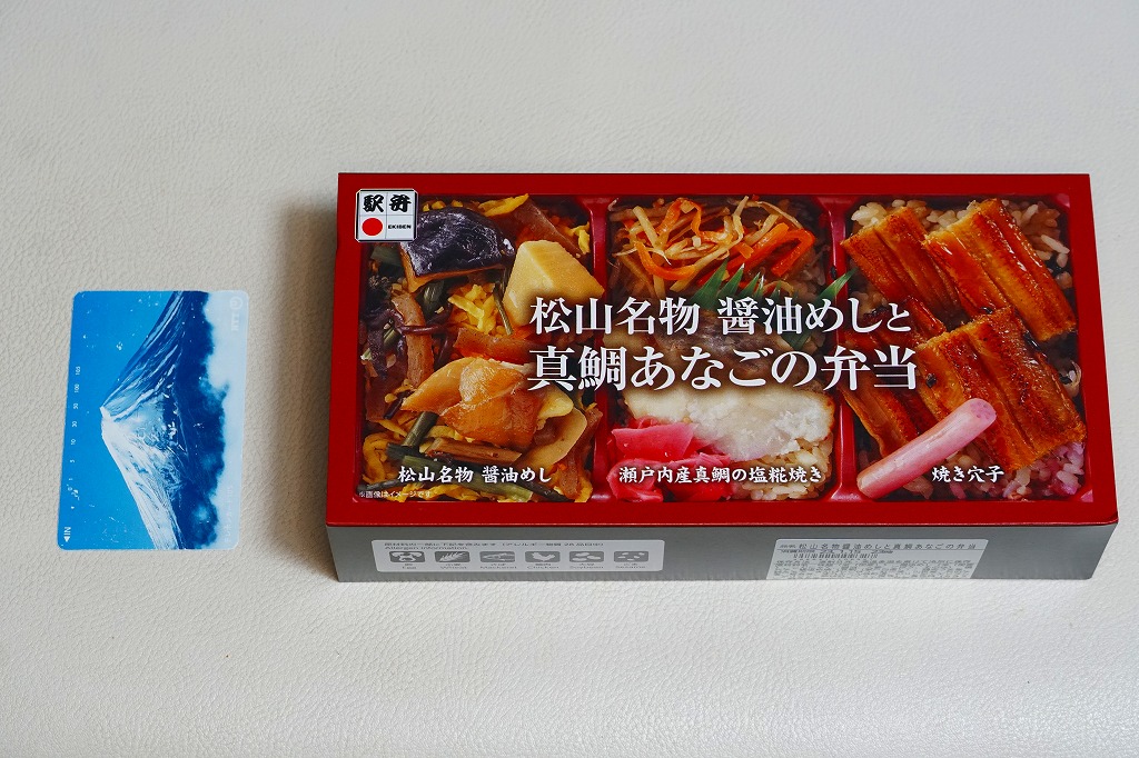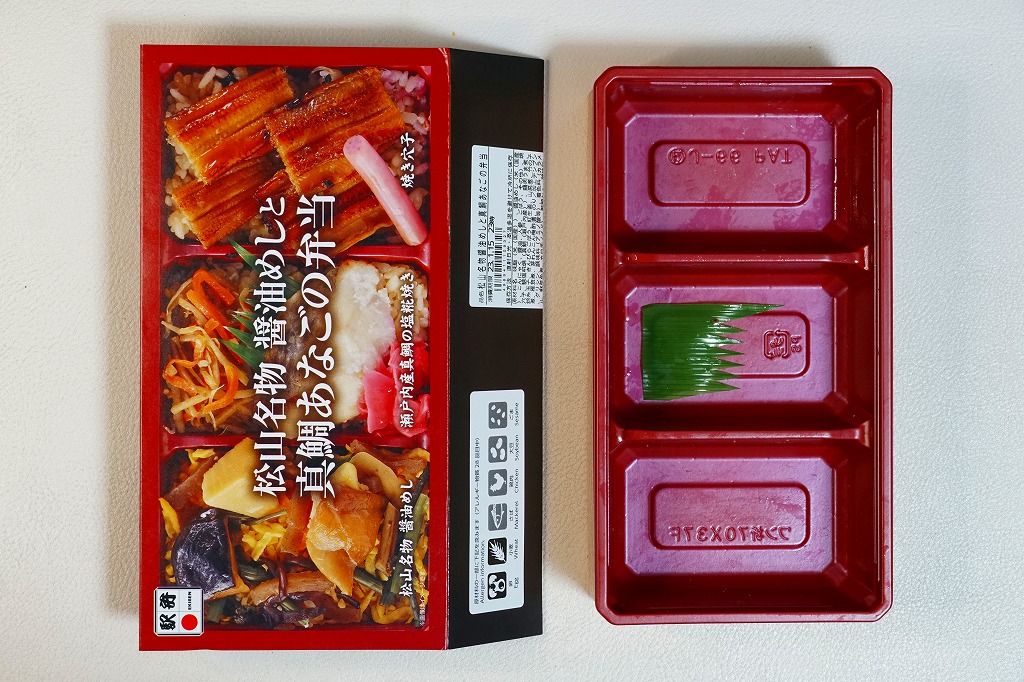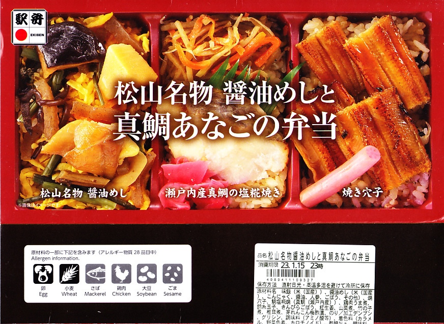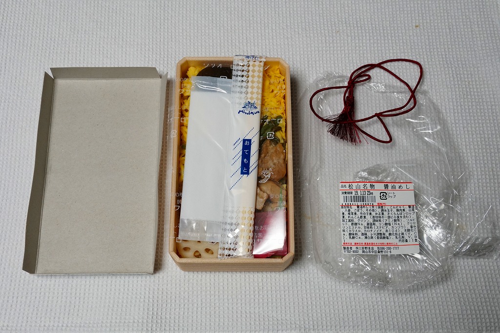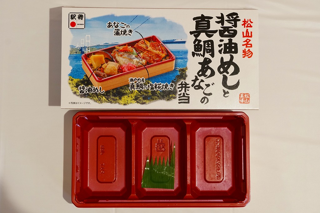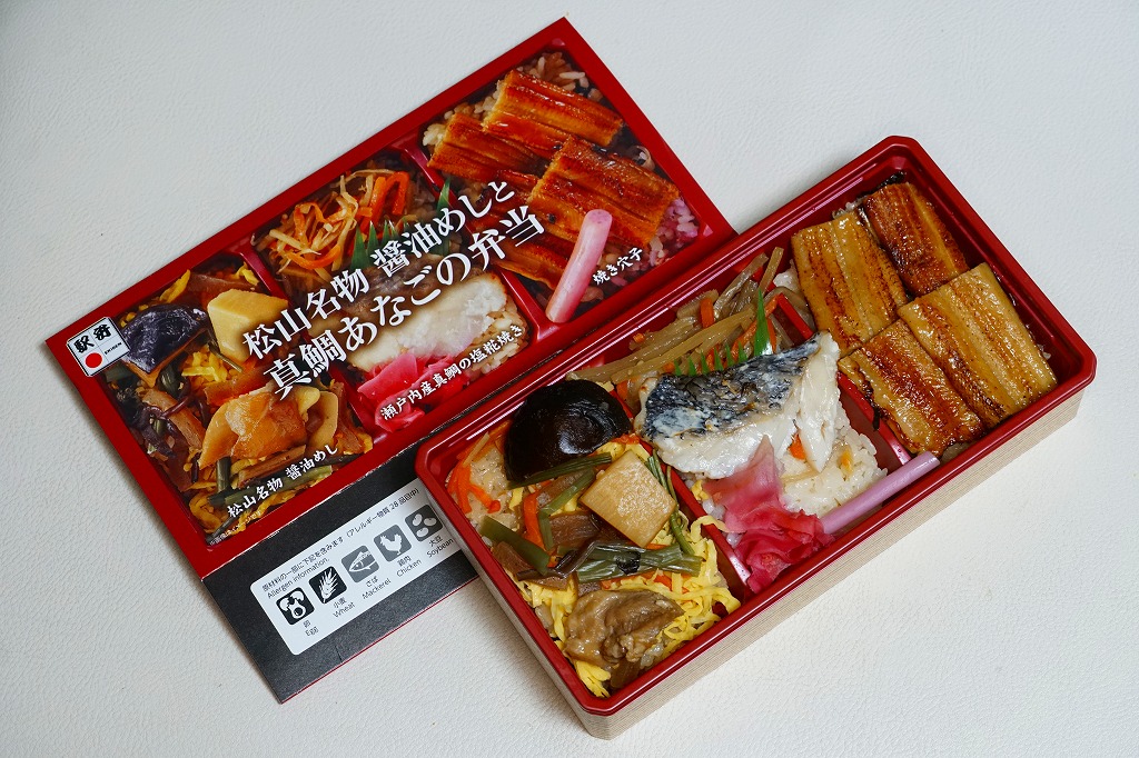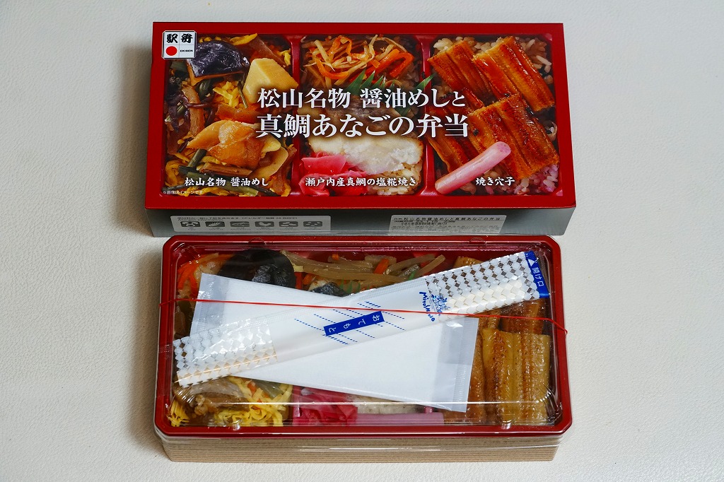 2022(令和4)年8月1日に松山駅や岡山駅で発売か。駅弁の名前のとおり、スリーブの写真のとおり、長方形のプラ容器の3区画に、こいくちしょうゆの炊込飯を五目の具材で覆う「松山名物醤油めし」、味飯にタイときんぴらごぼうと紅生姜を載せた「瀬戸内産真鯛の塩麹焼き」、味飯をに焼穴子を貼り付けて芽れんこん梅酢漬を添えた「焼き穴子」を詰める。名前も内容も地味になりがちな醤油飯に、別物を仕込んで派手に華やかにして、この程度の値段なら納得の一品。松山駅の駅弁は入荷数が少ないのか、売り切れの状態しか見たことがないので、予約をするか催事で買うのが吉。