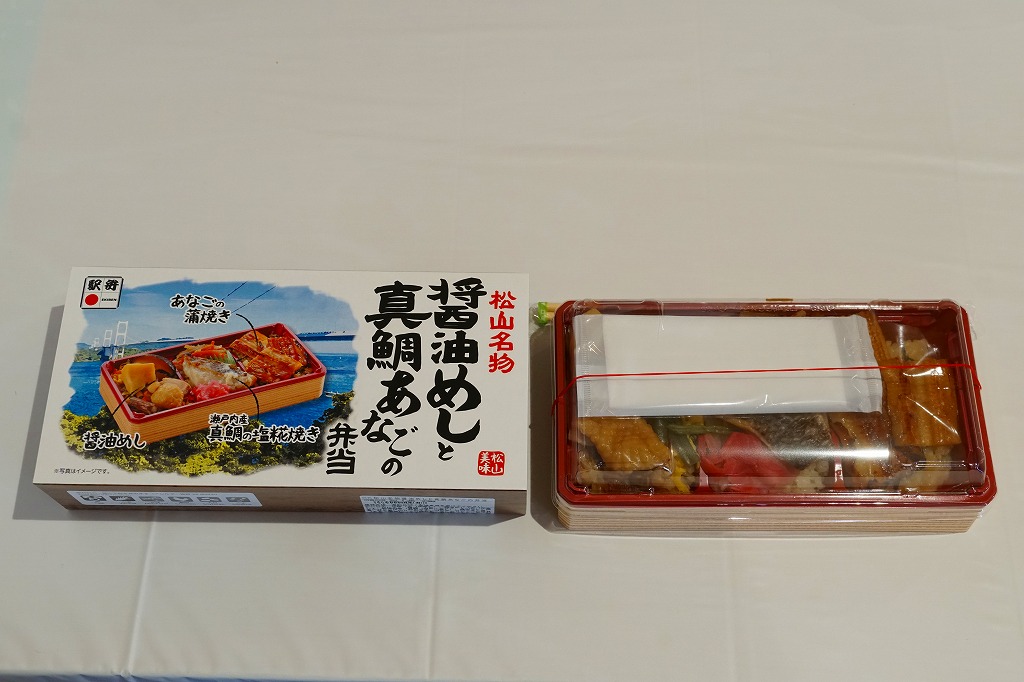 上記の駅弁「松山名物醤油めしと真鯛あなごの弁当」の、2023(令和5)年時点での姿。スリーブの絵柄はまるで異なるが、容器や中身や価格は変わらない。