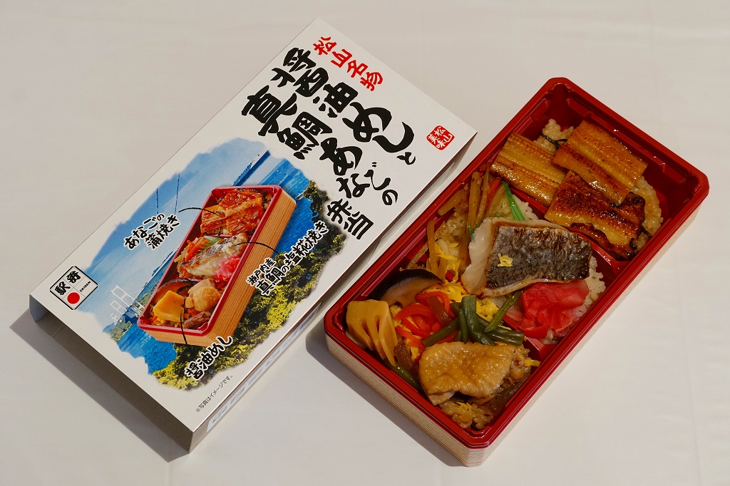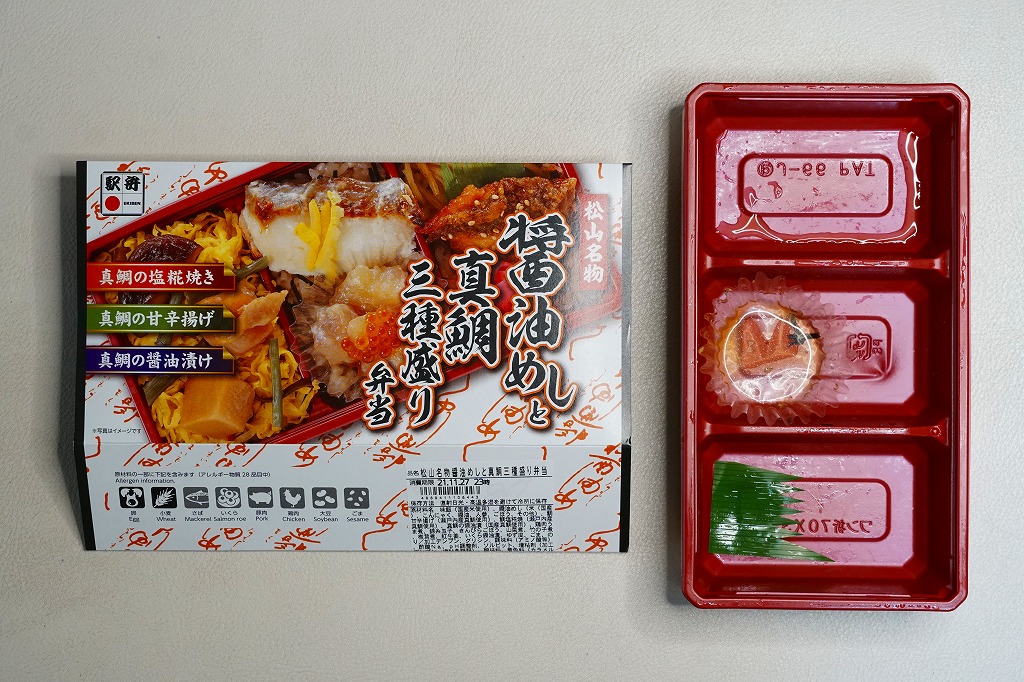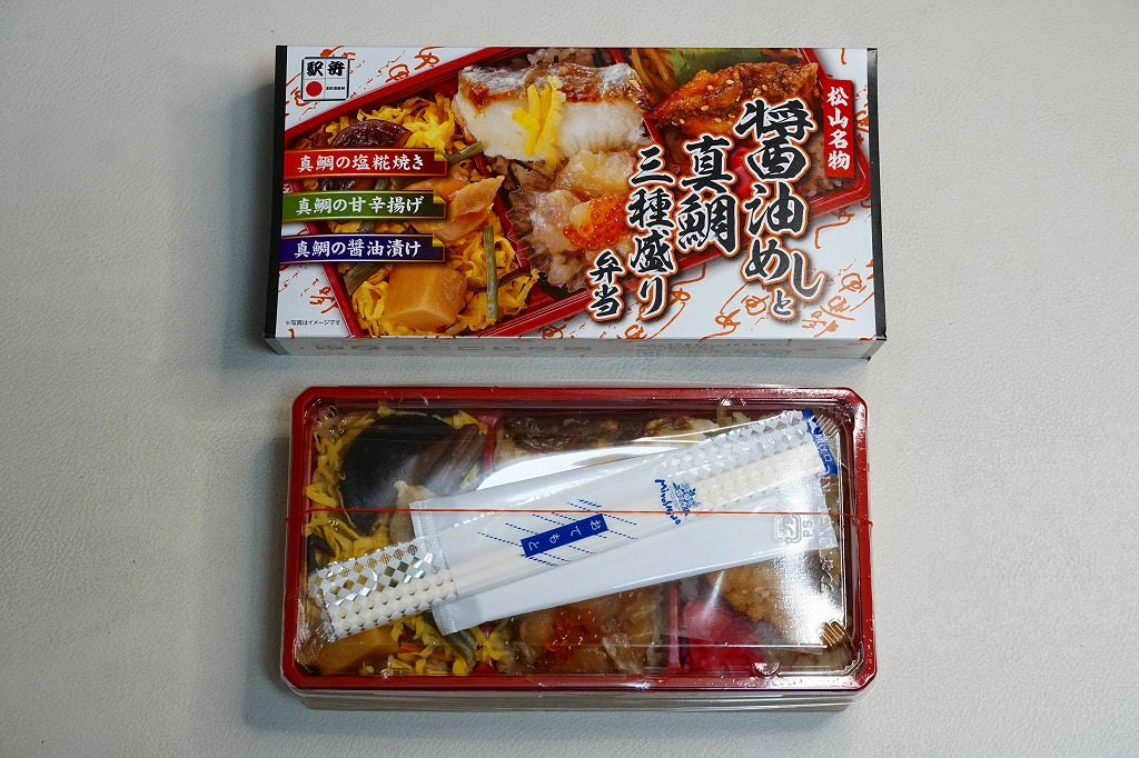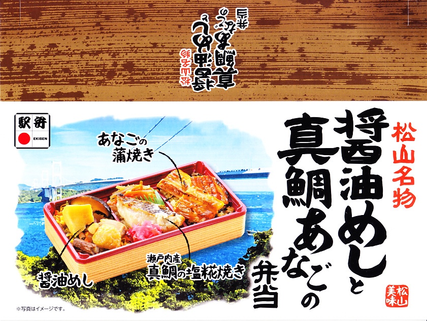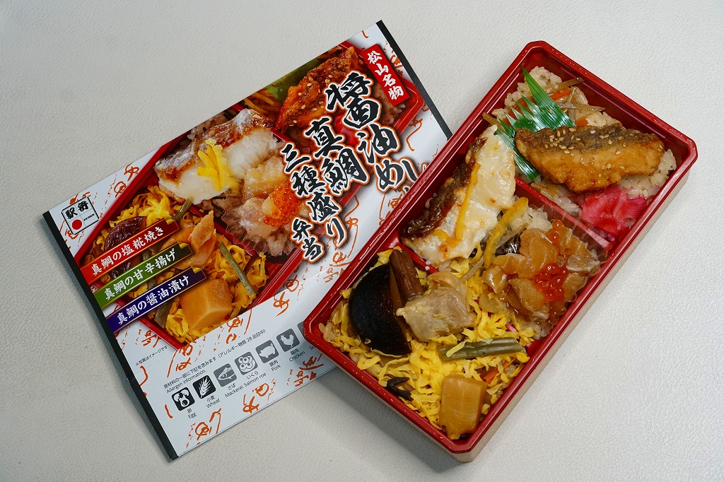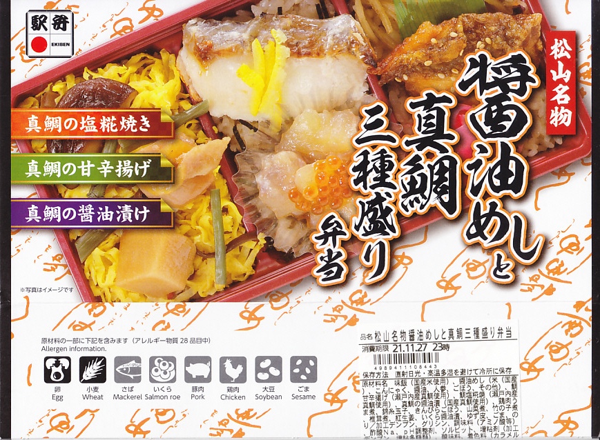 2021(令和3)年9月に松山駅と岡山駅と駅弁催事で発売。駅弁の名前のとおり、容器の3区画に醤油めしや茶飯を詰め、真鯛の甘辛揚げときんぴらごぼうと紅生姜、真鯛の塩麹焼きと、真鯛の醤油漬けにイクラや海苔やゆず皮、鶏肉やシイタケやタケノコや山菜に錦糸卵で、それぞれを覆う。駅弁の名前どおり、スリーブの写真どおりの内容。食べれば魚の焼き物のお弁当という印象。名前も見た目も内容も、そして利幅でも催事では苦戦しそうな「醤油めし」にかわり、こちらが活躍するのだろうと思う。1年間弱の販売か。