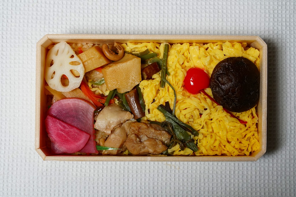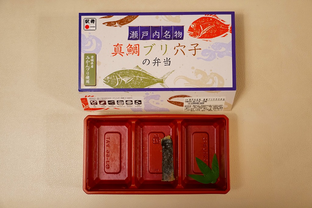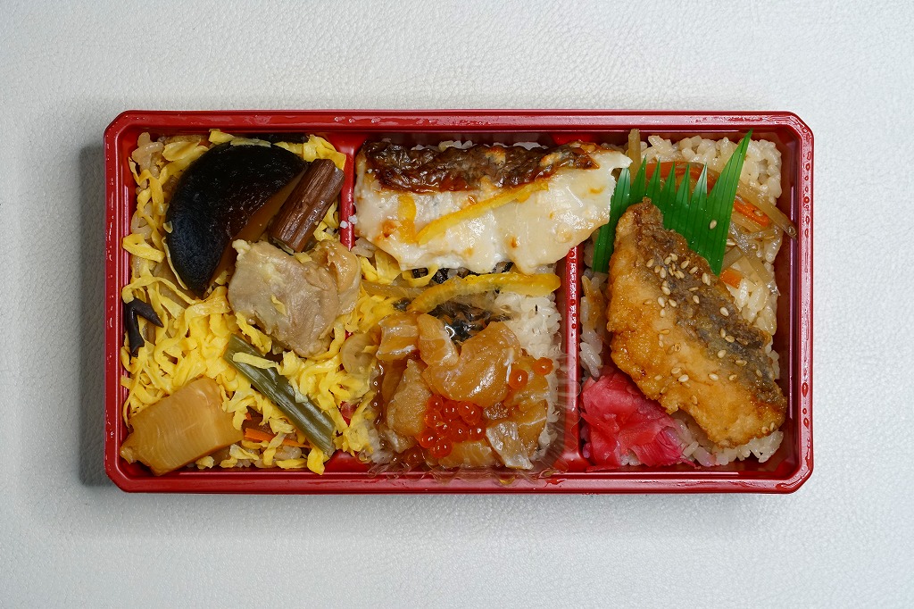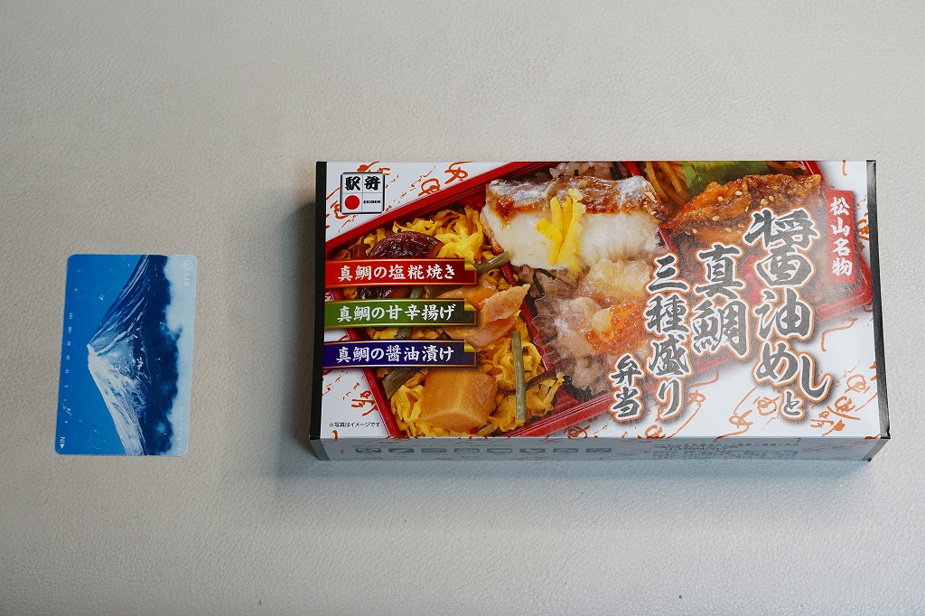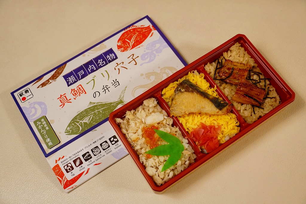 2021(令和3)年9月に松山駅と岡山駅と駅弁催事で発売。駅弁の名前のとおり、容器の3区画に醤油めしや茶飯を詰め、真鯛の甘辛揚げときんぴらごぼうと紅生姜、真鯛の塩麹焼きと、真鯛の醤油漬けにイクラや海苔やゆず皮、鶏肉やシイタケやタケノコや山菜に錦糸卵で、それぞれを覆う。駅弁の名前どおり、スリーブの写真どおりの内容。食べれば魚の焼き物のお弁当という印象。名前も見た目も内容も、そして利幅でも催事では苦戦しそうな「醤油めし」にかわり、こちらが活躍するのだろうと思う。1年間弱の販売か。