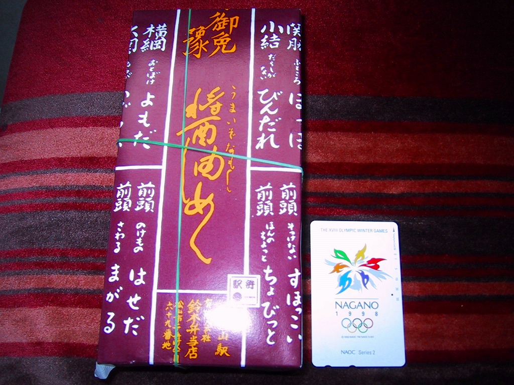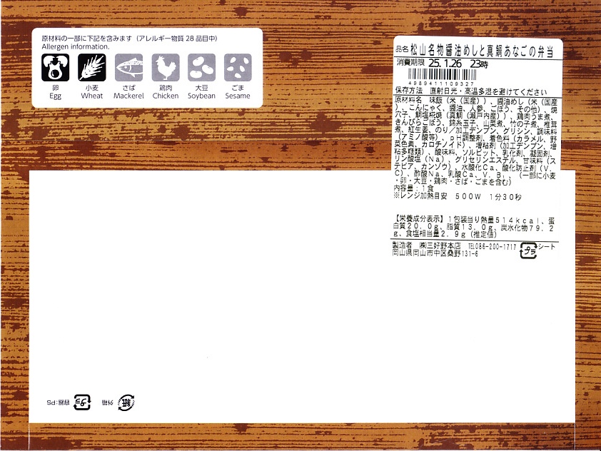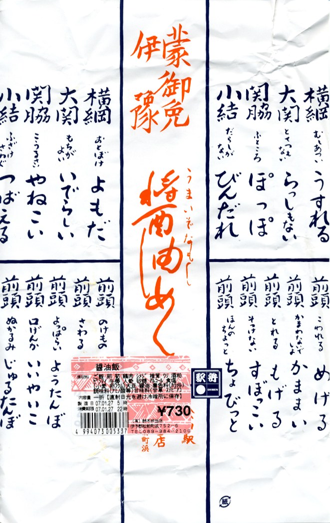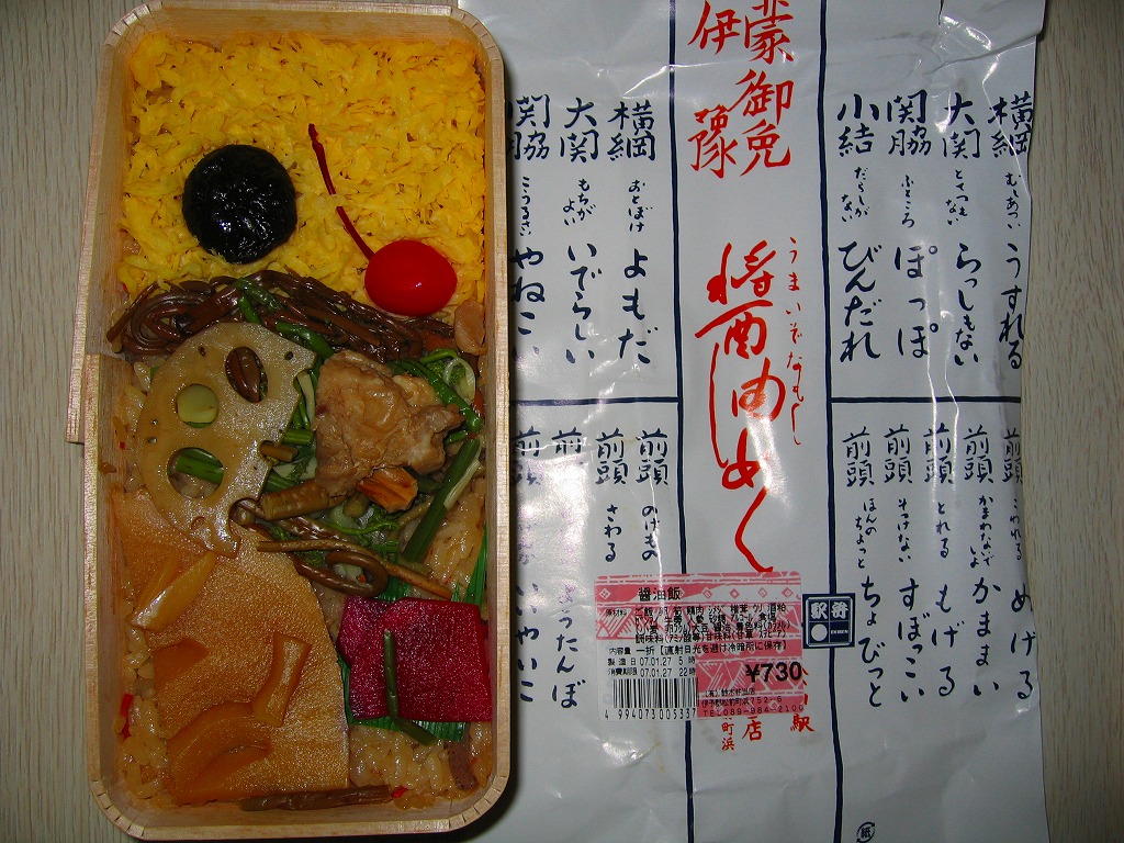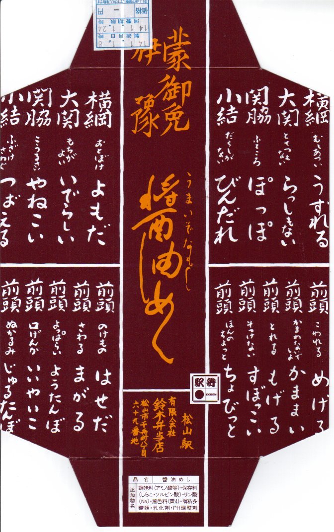 醤油めしとは、伊予地方で昔から親しまれる郷土料理で、こいくちしょうゆを使った炊込飯。見るからに、聞くからに、なんとも塩辛そうではあるが、醤油はほのかに香るだけでまったく刺激はなく、むしろ甘みを感じた。ボール紙製のふたには、伊予の方言が相撲の番付表を模して並ぶ。価格は2007年の購入時で730円、2017年時点で800円、下記の再発売時で780円、2023年時点で880円、2025年時点で950円。