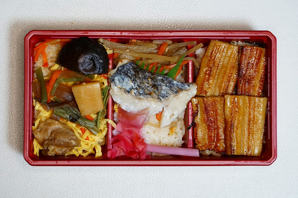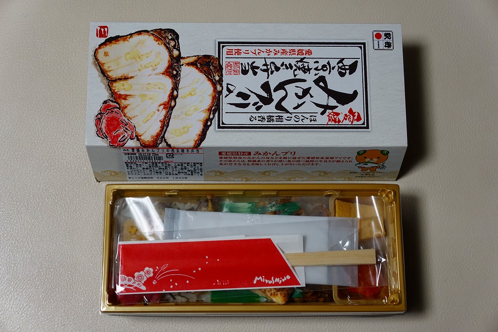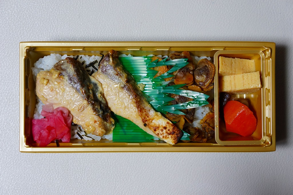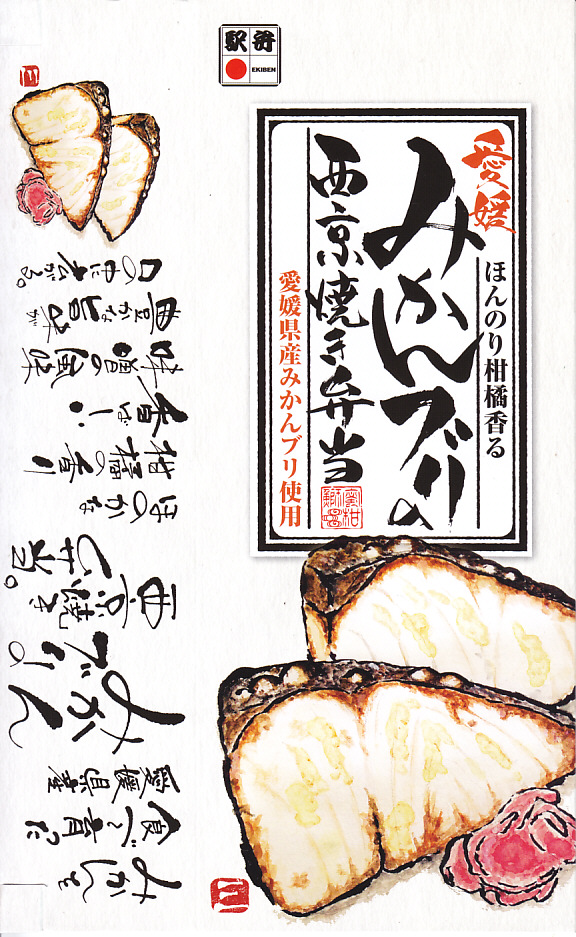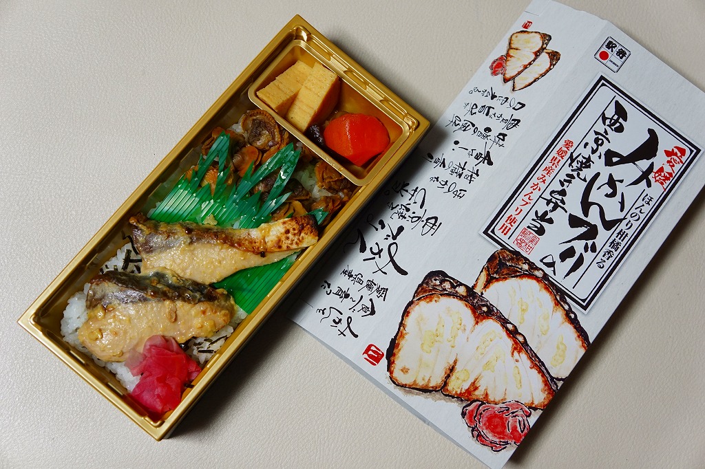 中身は白御飯をブリ西京焼2切れとも貝煮で覆い、玉子焼、人参と椎茸の煮物、紅生姜を添えるもの。味噌が味と香りでおいしい焼き魚丼も、みかんや柑橘類の風味がどこにもないのは、使うのはミカンでなく、みかんの皮などを餌に混ぜて養殖した「みかんブリ」だから。今の人気は肉駅弁で、輸送駅弁が肉々しい駅弁売店で買ったので、こんなお魚の駅弁が存在することに清涼感があった。2018年までの販売か。