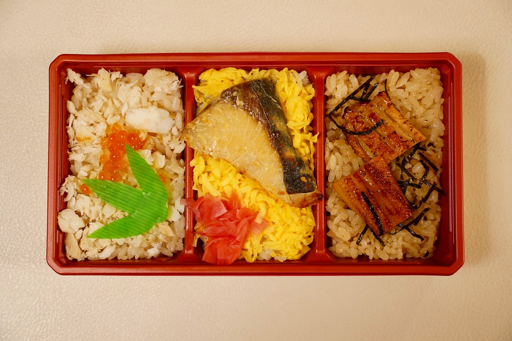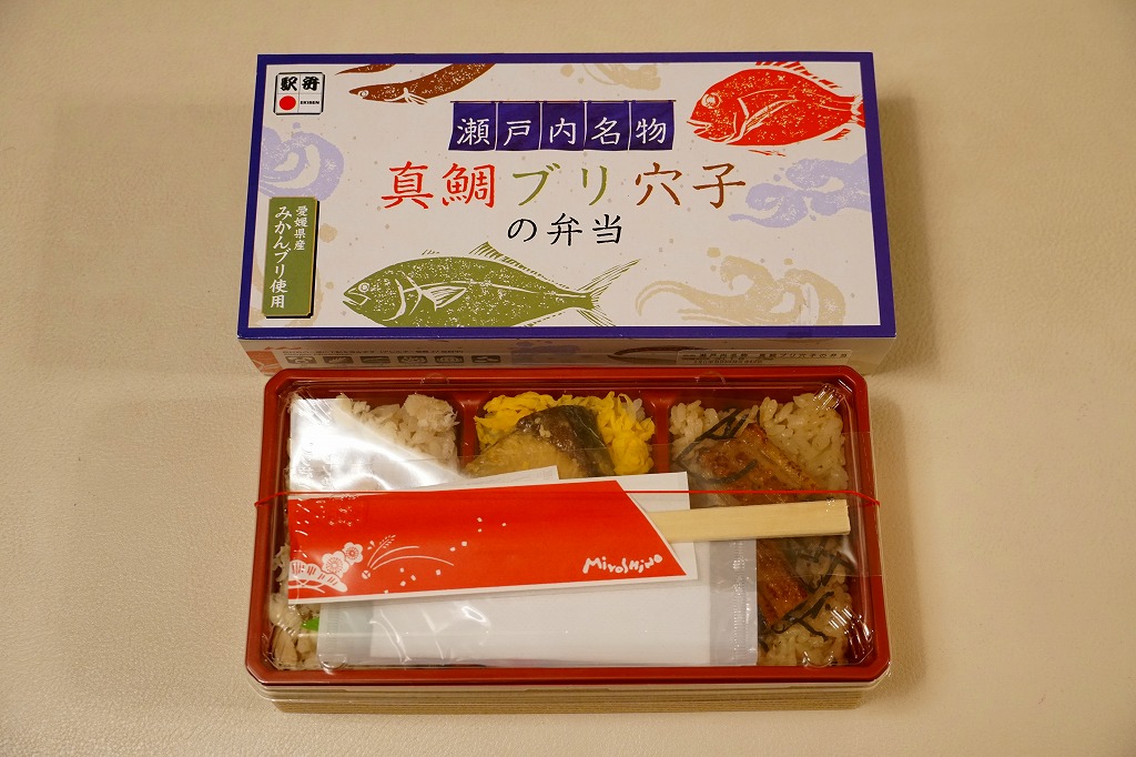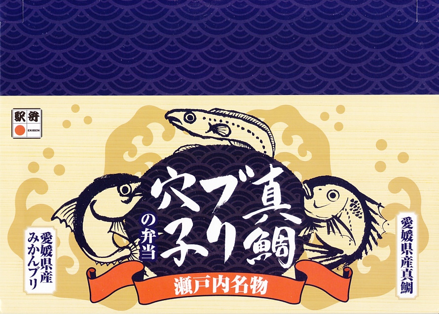 中身は真鯛丼とブリ丼と穴子丼のセット。3区画のそれぞれで、鯛だし入り味飯に愛媛県産の真鯛のほぐし身とイクラを載せ、白飯に錦糸卵で覆い愛媛県産みかんブリの西京焼きと紅生姜を載せ、味飯に刻み海苔を振って穴子の蒲焼きを載せる。おかずがないので雑味と色彩と価格が抑えられた印象。価格は2017年の発売時や2020年の購入時で1,000円、2021年時点で1,100円。2021年までの販売か。