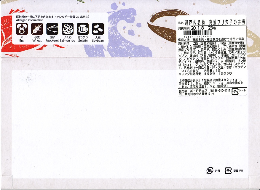 2018(平成30)年1月28日に購入した、松山駅弁あるいは岡山駅弁のスリーブ。この駅弁の発売時は、こんな絵柄だった。価格や中身は上記の2020年のものと、まったく同じ。