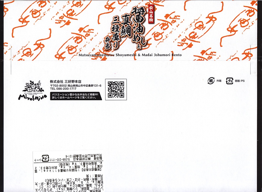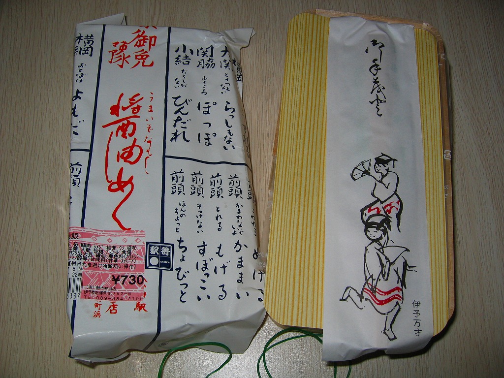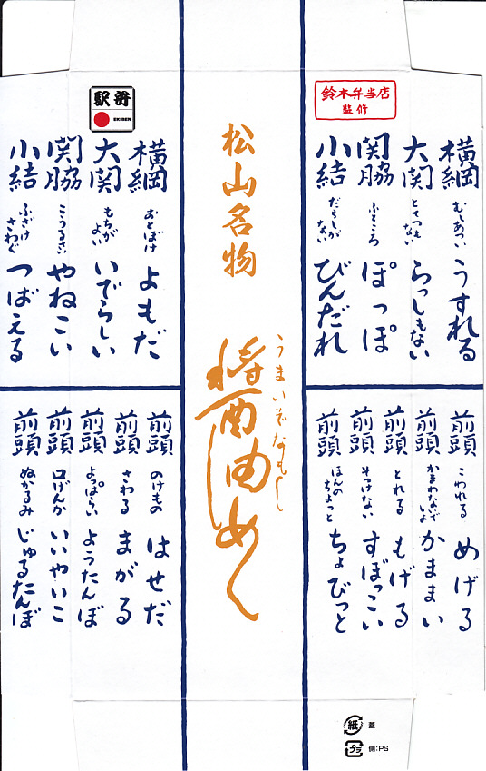 2017(平成29)年秋の新作。デパートの駅弁催事で松山駅の駅弁として売られ、パッケージの記載でも愛媛県の駅弁に見えて、調製元は岡山駅弁の三好野本店であり、主に東京都内の駅弁売店で売られるという、属地不詳な存在でデビューした。岡山駅の駅弁と紹介されることもある。