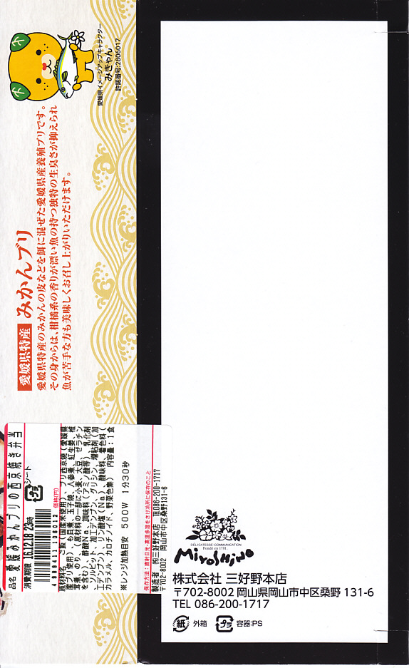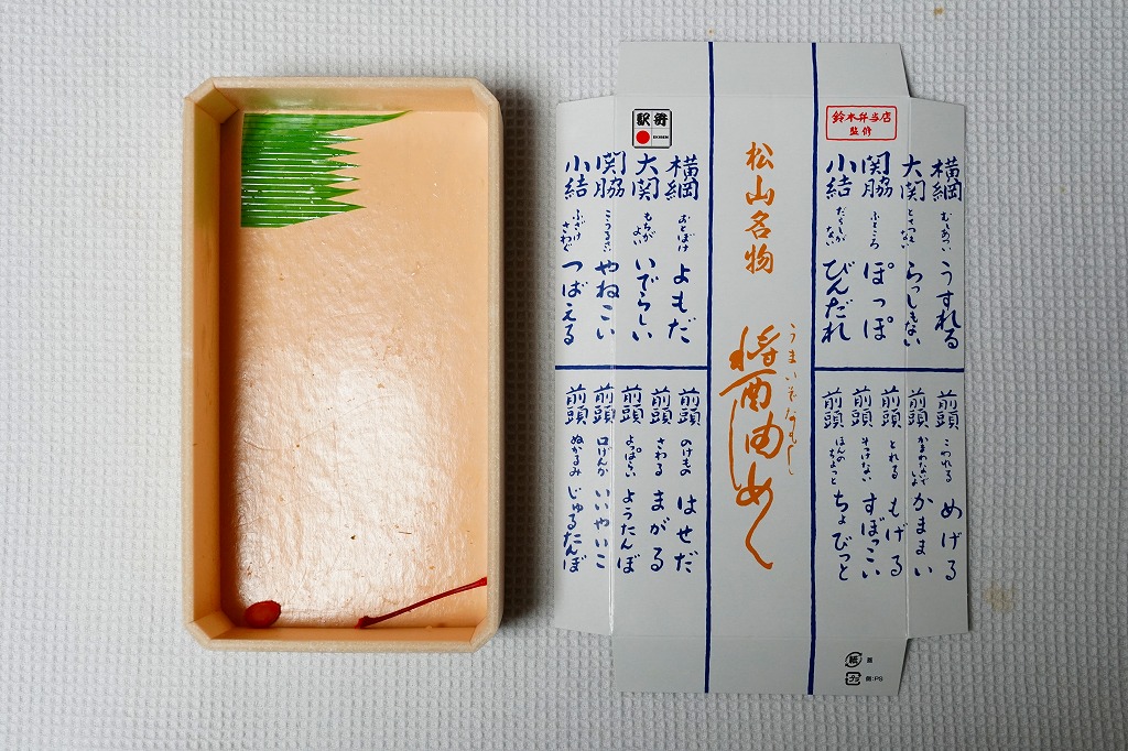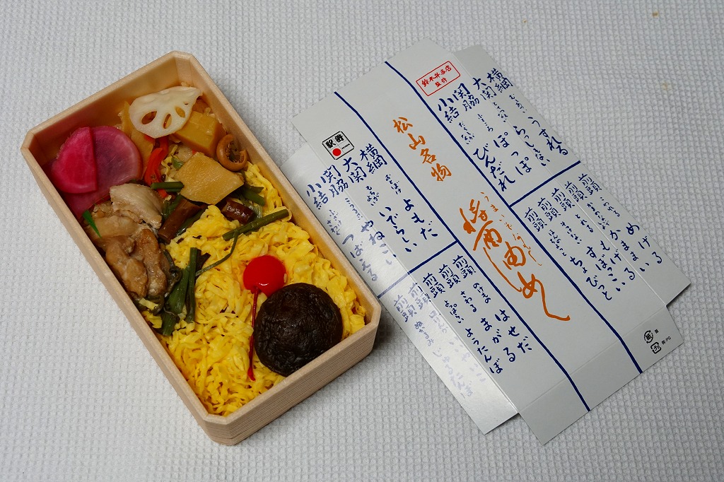 2016(平成28)年秋の新作か。発売時は主に東京都内で売られたようで、販売箇所によって岡山駅弁とも松山駅弁とも記された。調製元が岡山駅の駅弁屋で、松山駅の駅弁屋が消えたことでこの駅の駅弁も作ることになり、2018(平成30)年8月に名実とも松山駅弁の一員になった。スリーブには商品名や宣伝文で愛媛の名が何度も現れ、愛媛県のゆるキャラ「みきゃん」もいるので、現物では愛媛県の駅弁にしか見えない。