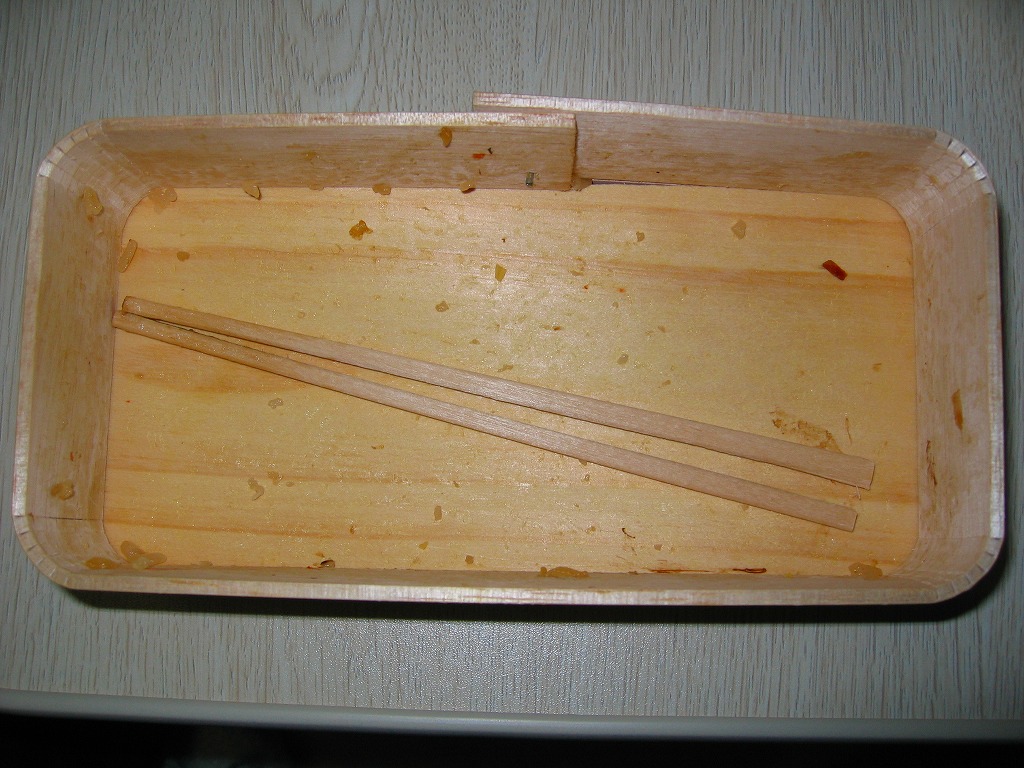 上記の駅弁「醤油めし」の、2007(平成19)年時点での姿。見た目や内容は変わらない。調製元の事業停止で終売となるまでは、経木折に掛紙をかけていた。