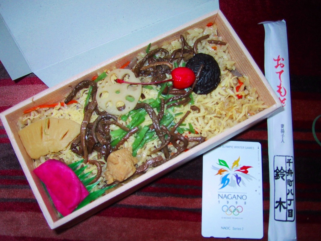 上記の駅弁「醤油めし」の、2002(平成14)年時点での姿。プラ製容器にボール紙のふたをかける現代風の姿が、上記のとおり後に経木折と掛紙を使う古風な姿に変わることになる。当時のふたは醤油色であり、名前と見た目で辛そうなものだった。