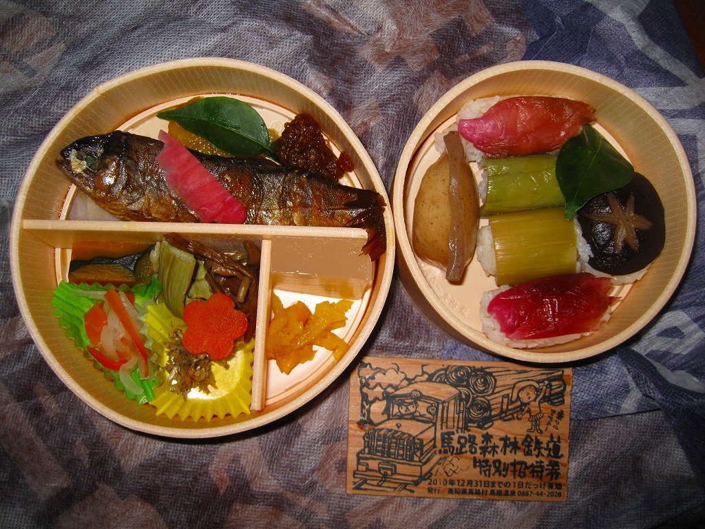2007(平成19)年8月に、馬路温泉のミニ森林鉄道の運行日である日祝日に、一日10個の販売で発売したそうな。2010(平成22)年1月の京王百貨店の駅弁大会で、地域おこし商品として実演販売された催事弁当。円形の容器を大小2個使用、それぞれに透明なふたをして、「馬路森林鉄道特別招待券」なる木片を載せて、和紙風の風呂敷で包む。中身は上段が御飯でタケノコ、ミョウガ、シイタケ、コンニャクをネタにした柚子風味のにぎり寿司、下段がおかずでアメゴ甘露煮、山菜やカボチャなどの煮物、じゃこ、なます、ゆずようかんなど。