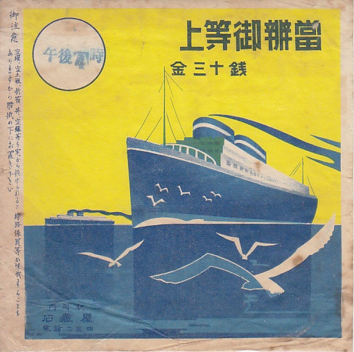 1930年代の調製と思われる、昔の門司駅弁の掛紙。カモメが舞う海に、2隻の客船が勇ましい。
