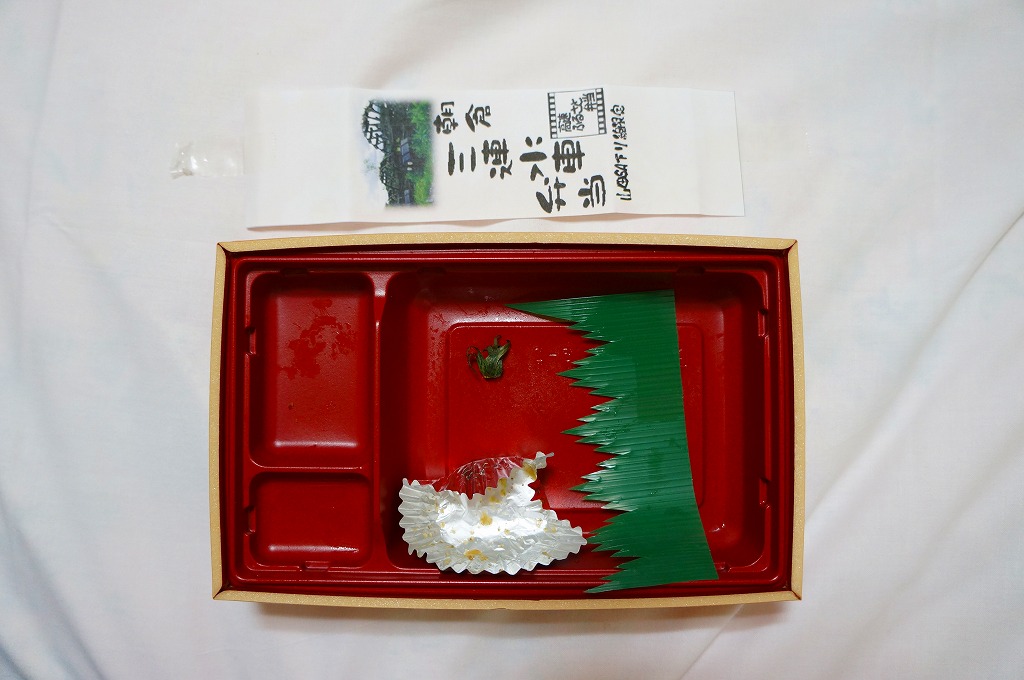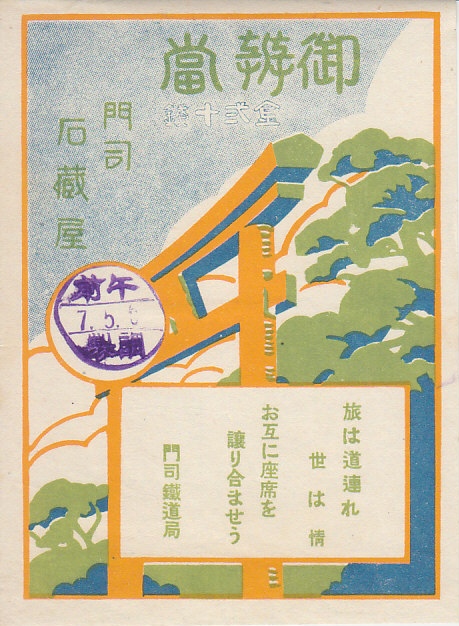 おそらく1930年代の、5月5日7時の調製と思われる、昔の門司駅、現在の門司港駅の駅弁の掛紙。絵柄は和布刈(めかり)神社をイメージしたものかどうか。