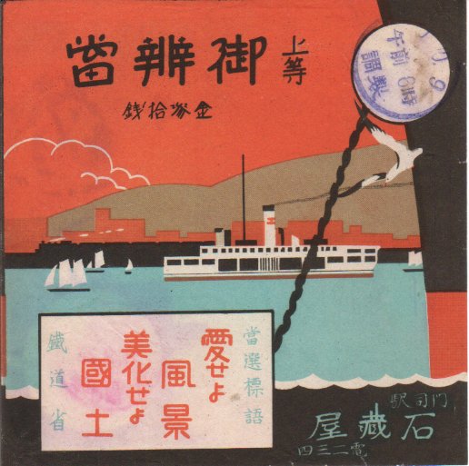 1934(昭和9)年10月9日6時の調製と思われる、昔の門司駅弁の掛紙。関門海峡と鉄道連絡船を描き、背景は文字の市街と砂利山か。当時の門司駅は、現在の門司港駅で、1942(昭和17)年4月1日の改称。本州と九州を海底下で結ぶ関門トンネルの開通前、下関とこの門司駅は所要時間15分の鉄道連絡船で結ばれ、鉄道省で九州を所管する門司鉄道管理局が置かれる、九州内では博多駅や小倉駅も及ばない最重要の駅であった。「愛せよ風景 美化せよ国土」の標語は当時の、昭和恐慌後から日中戦争前くらいの間の鉄道省の当選標語だそうで、一部の駅弁掛紙に記載される。