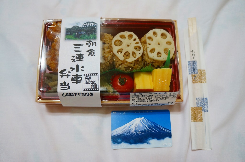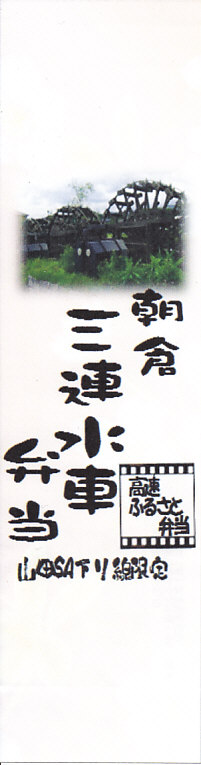 福岡県内で甘木市と朝倉町と杷木町が2006年に合併して誕生した朝倉市では、筑後川の水を田畑へ引くために江戸時代に設置された水車が残り、これが1990年7月に「堀川用水及び朝倉揚水車」として国指定史跡となった。水の力で水を汲み上げる2連や3連の大型木造水車は朝倉市が誇る観光資源であり、市の公式サイトの最上部に画像が載ったり、公設の観光施設名が「三連水車の里あさくら」であったり、この弁当の商品名にもなっている。