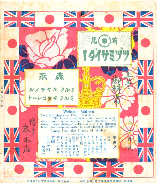 1922(大正11)年のものと思われる、昔の博多駅弁の掛紙。同年に上野公園で開催された平和記念東京博覧会で英国の皇太子殿下が来日されたことを記念して、全国各地の駅弁屋が同じデザインの記念掛紙を使用したもの。周囲に日本と英国の国旗を配し、右に駅弁の名前、左下に調製元、下部に日英の歓迎文、上部の2枠は広告枠。